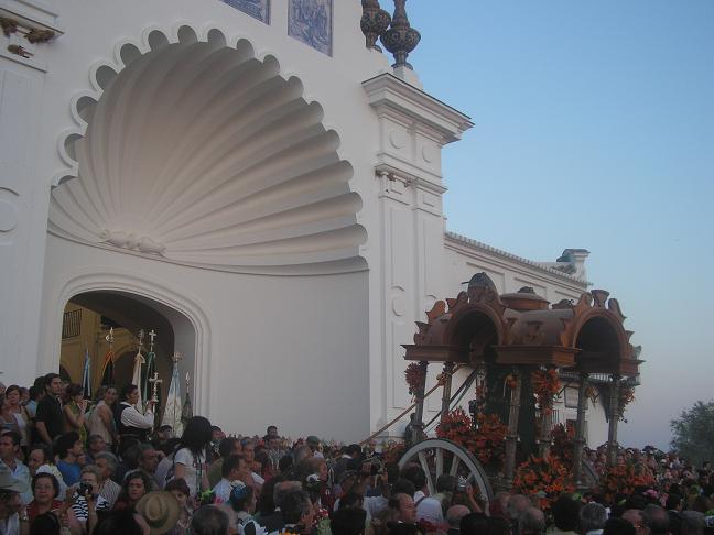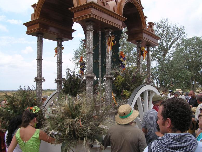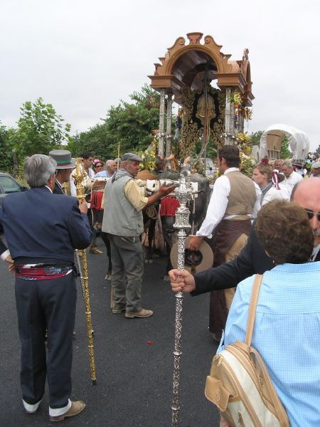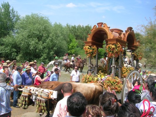 Y por fin, la mañana siguiente, sábado treinta, salida para hacia la Aldea del Rocío, por primera vez como Hermandad Filial. El Simpecado iba sobre una carreta tirada por bueyes, regalo de Antonio López Luque, «El Quemao», llamando poderosamente la atención en su sencillez y belleza, brillando su esplendidez del oro bordado sobre el fondo verde oscuro del terciopelo.