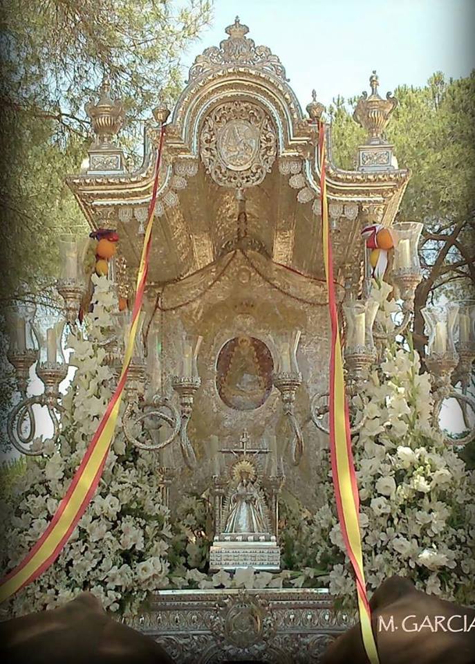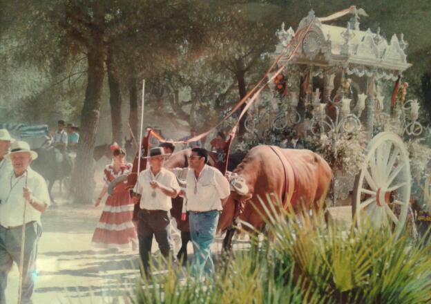 Era esta primera carreta toda de madera, por completo cerrada salvo un balconcito que miraba a donde la yunta, y que era el altar de la Virgen y la hornacina donde se colocaban las pocas velas y menos flores que allí cabían. Y así, la Señora quedaba protegida en su Simpecado de los azares de la peregrinación, ya fuese lluvia o viento, calores o fríos, blanduras o polvo; porque su imagen no sufriese descalabro ni daño alguno. Y aunque el que escribe estas líneas no lo recuerda, ya porque no lo vio con sus ojos, ya porque no le alcanzaron los años para así verlo, tiene por cierto que el dicho cajón lucía sobre el balconcillo donde se colocaba el Simpecado de la Virgen Santísima, un escudo real con estampas del Sagrado Corazón de Jesús a entrambos lados. Y esto lo cree por haberlo leído poco ha en unas cuartillas cosidas de José Luís Escacena Fernández, que son escritas por una sola de sus caras de su puño y letra y de su manera abigarrada de escribir. Y no parece que cuenten mentira ni engaño alguno estos referidos pliegos porque su autor fue antiguo y primer fundador de esta Hermandad, y hoy Presidente perpetuo de ella, y por cierto persona rezadora donde las haya.