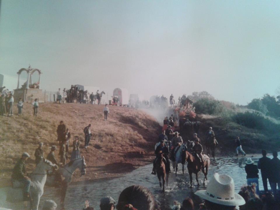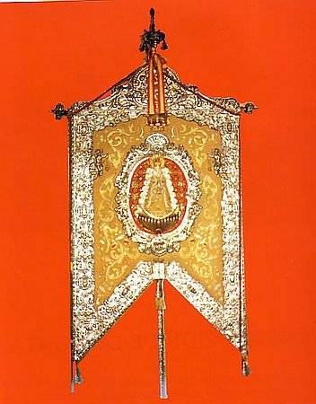 Llevaba también bordados en plata y oro, que hicieran las Salesas Reales, así el Simpecado como las banderas y los frontiles de los bueyes. Y todo lo hasta aquí dicho duró no más de 1945. Porque desde aquí hasta hoy no se ha vito más el antiguo cajón, ni en tiempos de romería ni en otras fechas, de suerte que resta poca memoria de aquellos primitivos enseres, a no ser la que guardan en sus adentros los hermanos mas viejos y otros ancianos del pueblo, que han visto el cambiar de los tiempos. Y así como las tapias de las casas, blancas de cal, se tornan primero verdes y luego negras por el mucho enmohecimiento de las lluvias, y un pan que fue blando vino al cabo a ser todo duro, andando el tiempo lo de plata y la pintura oro, en tal manera que ningún antiguo reconociera hoy su Hermandad a no ser por la leyenda que figura detrás del Simpecado, que con letra doradas dice: «Hermandad de La Puebla del Río».