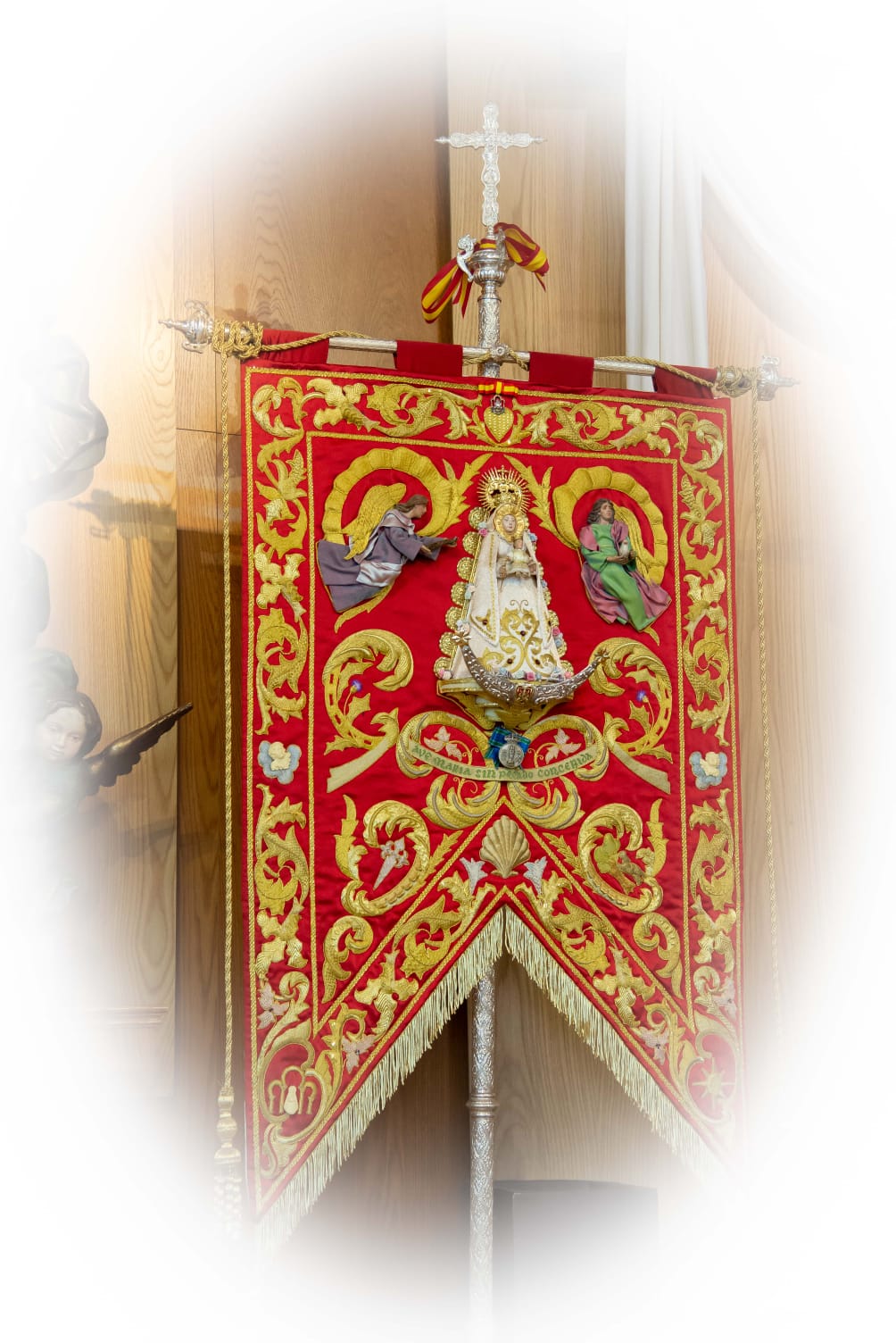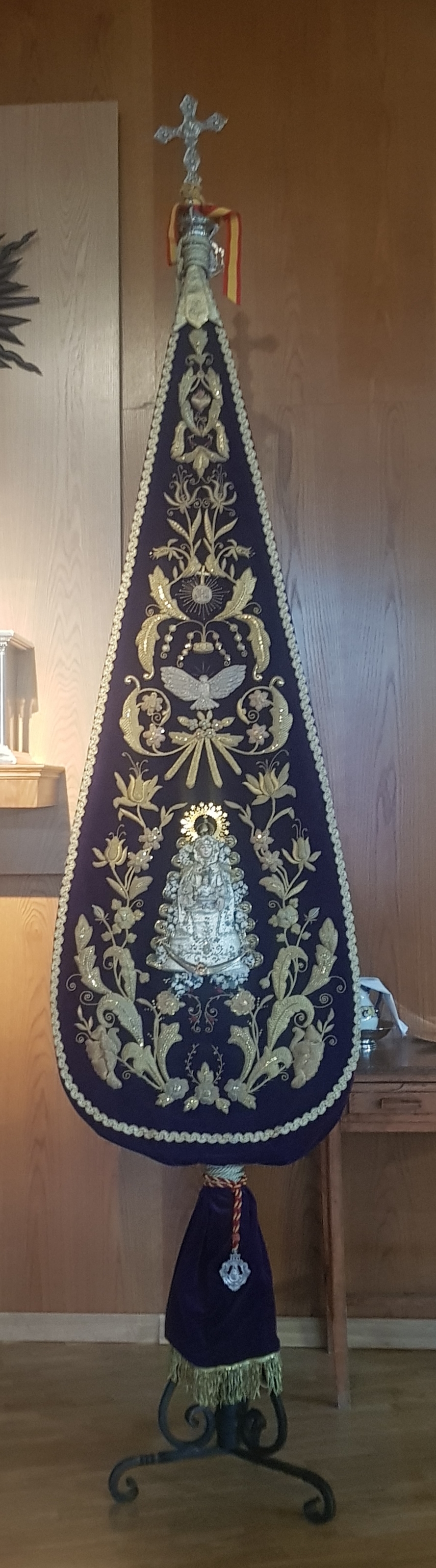 - Bordado a realce de oro entrefino sobre raso de seda Douchesse en su anverso, sigue un diseño original del taller, basado en uno de los lemas de la Hermandad, Corazones Rocieros. Presenta una cenefa de hojas de cardo que rodea el motivo.