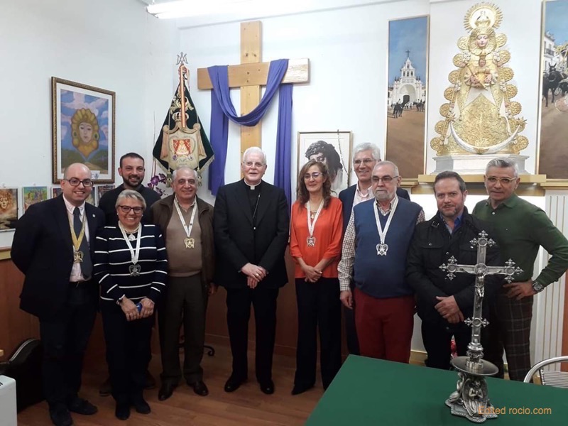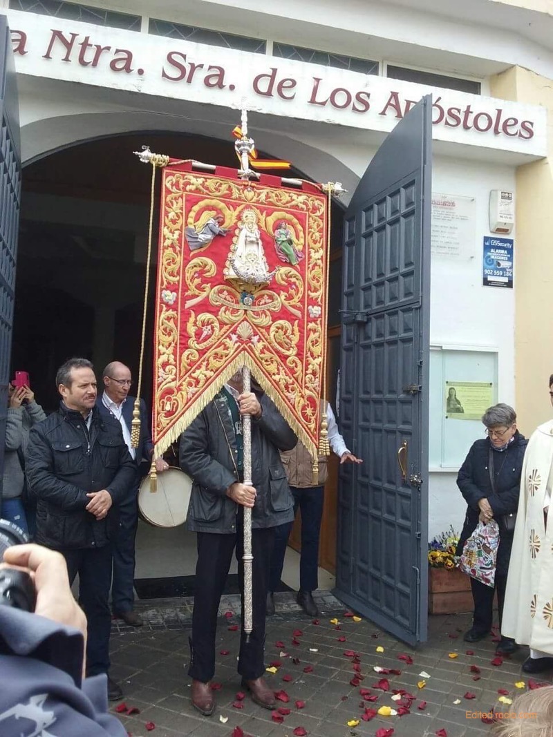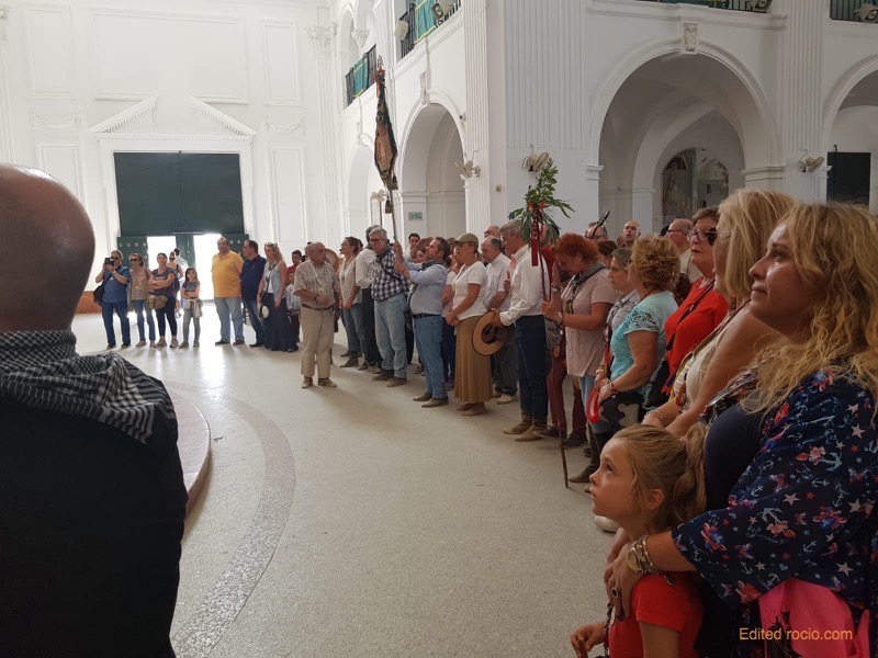 - En el centro, la Virgen del Rocío sobre una nube y dos ángeles en los laterales. En los extremos, la Cruz de Santiago a la izquierda haciendo alusión al peregrinaje y a la derecha San Isidro patrón de Madrid.