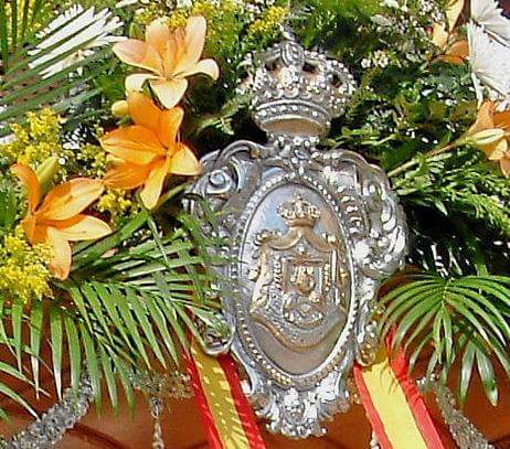 - En los medallones centrales se ve una cruz de Santiago y el escudo de Madrid, bordados en seda y plata y oro. En las puntas inferiores de la cenefa, en la izquierda aparece el sol y la Luna y en la derecha el escudo de la Hermandad Madrina de Nuestra Señora del Rocío de Córdoba,bordado en cartulina,con una pequeña imágen de la Virgen en marfilina.
