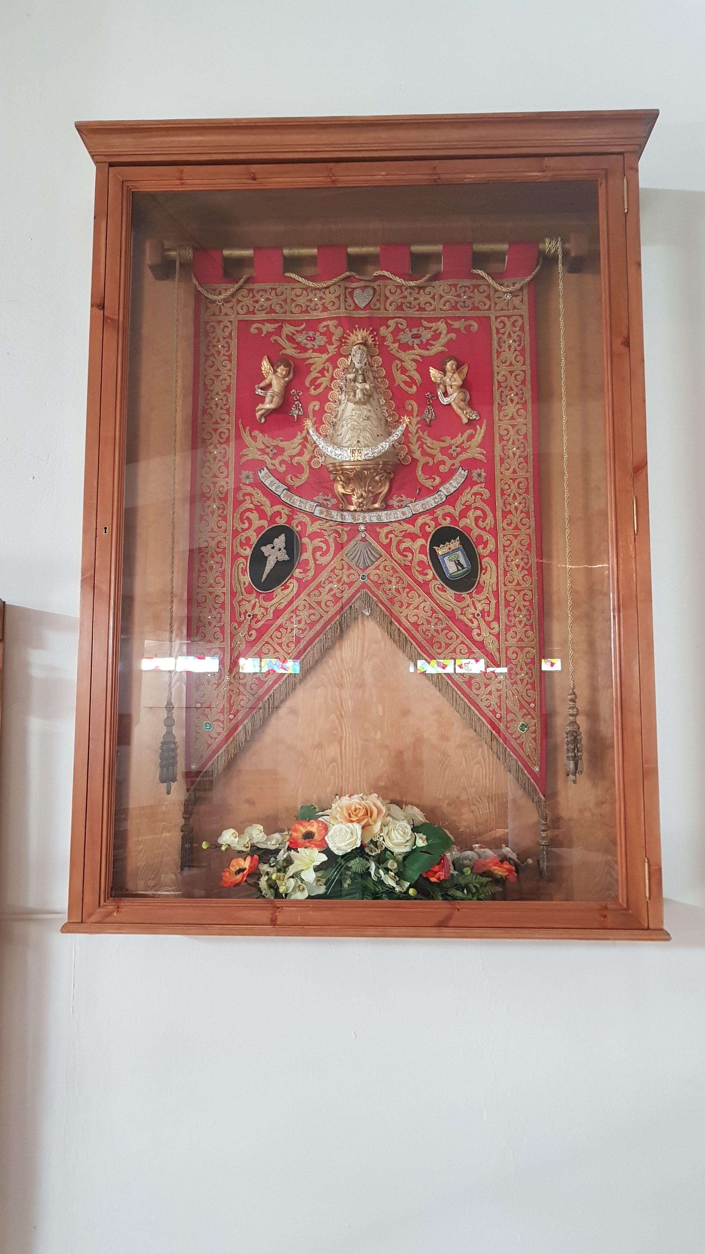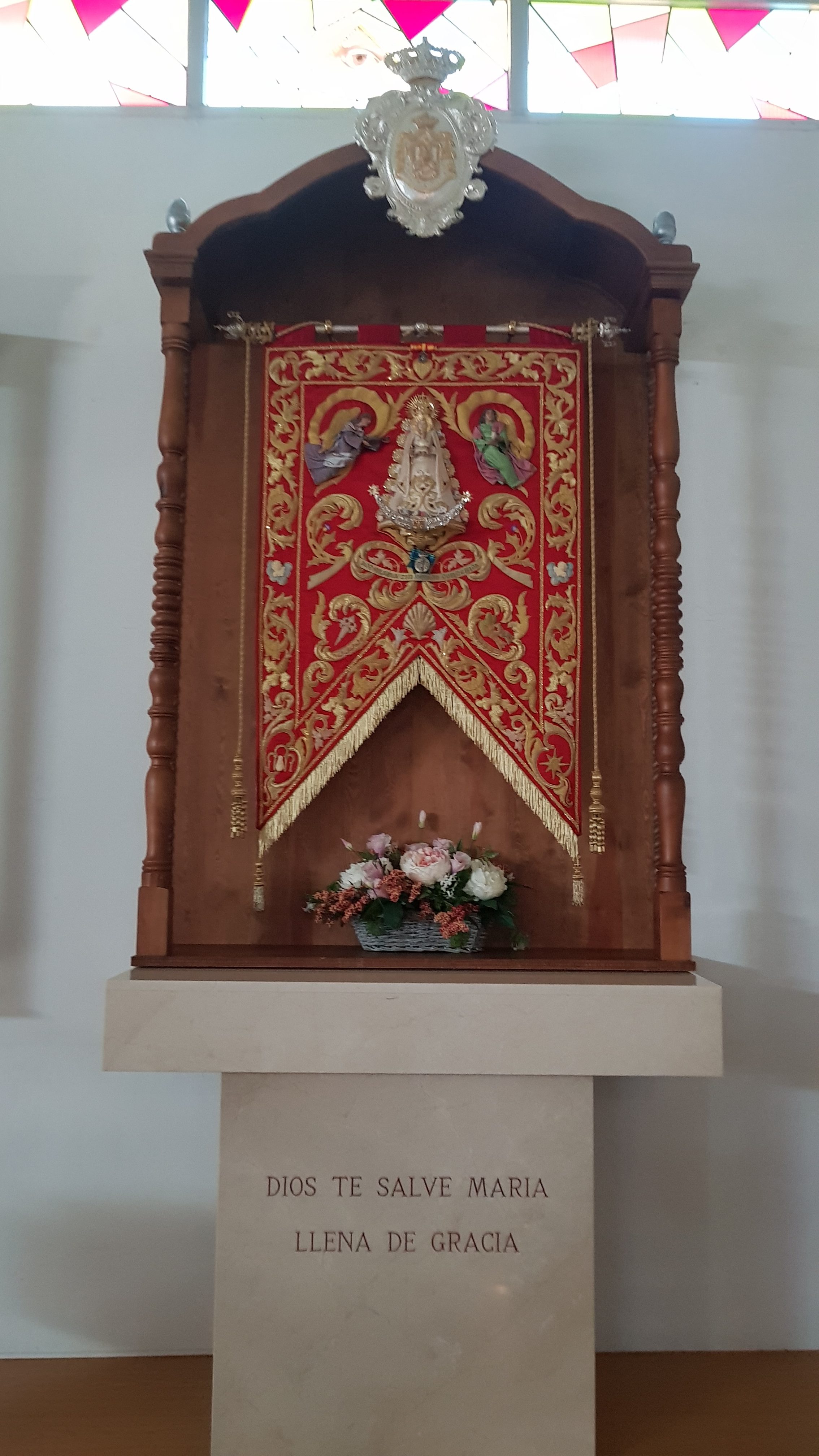 - Es de destacar la profusión de técnicas empleadas en el bordado del Simpecado, especialmente la filacteria que figura bajo la Virgen,en la que se puede leer, bordada en milane Ave María sin pecado concebida.
