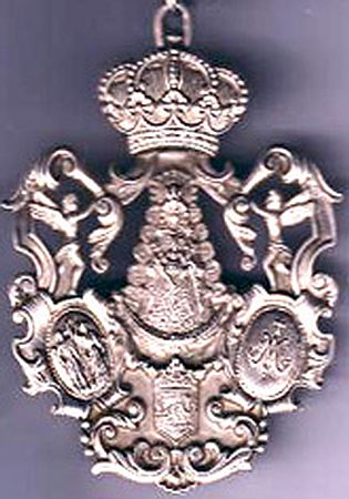 En plata, en su centro la imagen de Ntra. Sra. rodeada de dos ángeles que sostienen una corona real sobre Ella. Al pie el escudo de la Ciudad y dos cartela que representan a los patronos de Málag, San Ciriaco y Santa Paula y la otra el anagrama de María.