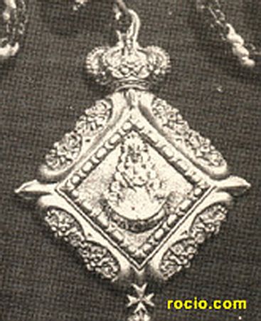 Rojo y blanco es el cordón del que pende la medalla de esta antigua Hermandad onubense. De plata o de metal plateado con forma cuadrangular, la única de esta clase de la colección rociera, sirviéndole de timbre la corona real cerrada, dispuesta en una de sus esquinas, la superior. Esto hace que se presente en bello equilibrio inestable. La imagen de la Virgen de la aldea marismeña, elemento inseparable de todos los medallones corporativos rocieros, se presenta en relieve, de cuerpo entero, con ráfagas, corona y media luna, enmarcada en un recuadro lobular inserto en una proporcionada cartela que deja entrever por sus flancos abiertos, correspondientes con el cuadro que sirve de base central, eslabones del collar de la Insigne Orden del Toisón de Oro rematados en la punta con la cruz de la Orden de San Juan de Jerusalén o de Malta y el cordero muerto de la leyenda del velloncino.