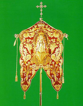 En 1987 se estrena el actual Simpecado de Paterna del Campo, realizado a semejanza del anterior en Coria del Río por José Mejías y Francisco Franco. Posee bordados en oro sobre terciopelo rojo y la imagen de la Virgen del Rocío en su centro, realizada por José Guzmán Vázquez. Se porta en carreta de madera construida por los hermanos Quitoli.