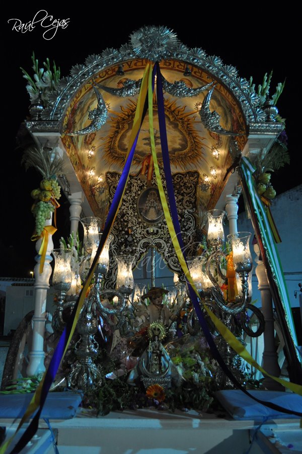 De forma circular, rodea a Ntra Sra. un adorno de hojas de olivo y frutos de membrillo. La Virgen se encuentra encima de un puente formado por ramas de olivo.
