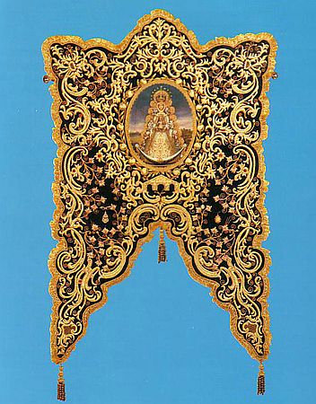 Data de 1982 y fue confeccionado en los talleres ecijanos de Joaquín Ojeda Osuna. De terciopleo rojo corinto, ostenta en su centro –descansando sobre un puente de tres arcos y orlado de ramas y frutos de membrillo– el óvalo con lienzo de la Virgen con galas de Reina.