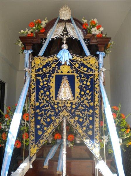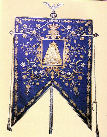 Fue confeccionado por las Madres Filipenses de la localidad, bordándolo en oro sobre terciopelo azul, color elegido, junto al blanco, en atención a la patrona local, la Virgen de Lourdes. La imagen de la Virgen que lo preside lleva enaguas blancas y un collar de perlas finas, idea ésta de la Madre Amada, artífice de la obra, que se inspiró en unas sevillanas que se cantaban por esas fechas. Fue bendecido el 13 de mayo de 1964.