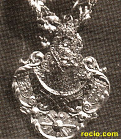 La efigie de la Santísima Virgen del Rocío, en metal dorado; bajo los pies de la Santísima Virgen, y en metal blanco, figura el anagrama de María y debajo un lucero, emblema de nuestra Parroquia de El Divino Salvador; a ambos lados dos cartelas con los escudos de Sevilla y de Almonte.