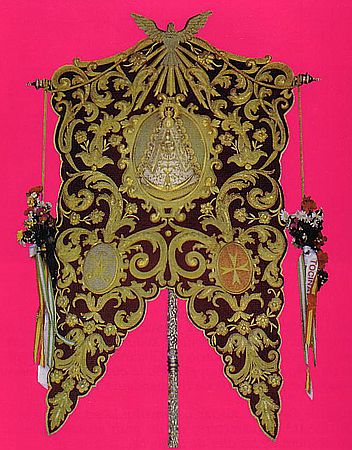 Confeccionado en terciopelo rojo con bordados en oro del más puro sabor barroco hispalense, ostenta en su centro una imagen de la Virgen con cara y manos de marfil. Fue realizado en los talleres de Fernández y Enríquez sobre un dibujo original de Antonio Garduño, estando terminado en abril de 1985. En 1987, tras un accidente, fue restaurado por Sobrinos de Elena Caro.