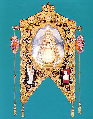 De metal palteado con la imagen de Ntra. Sra. delante y el nombre de la Hdad. detrás. Adornada con motivos frutales y coronada por un arcangel.