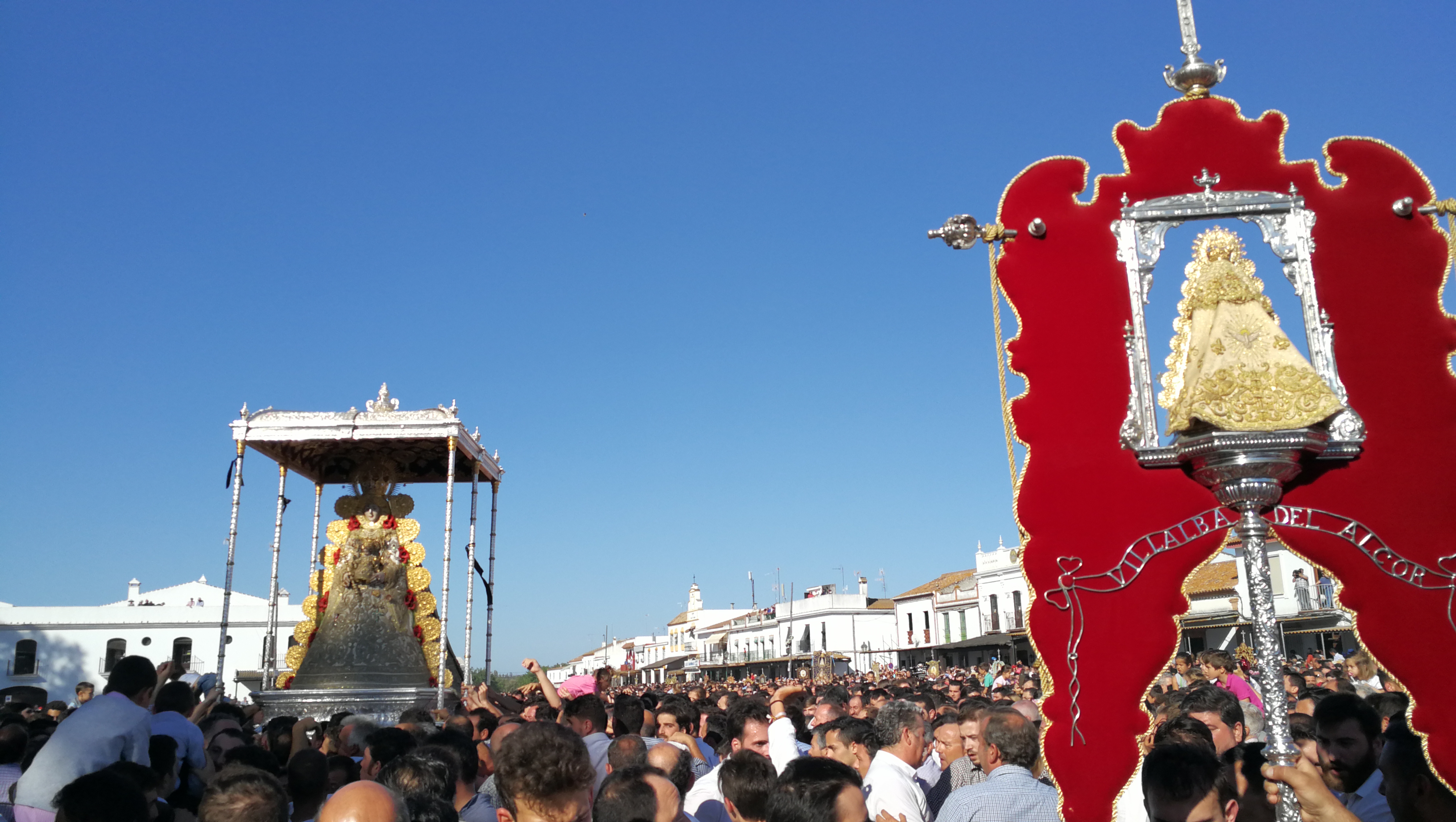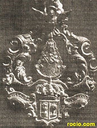 En el centro la imagen de Nuestra Señora del Rocío, con su traje de Reina, orlada con acantos y rocalla barroca, coronada por una Paloma, símbolo del Espíritu Santo de Pentecostés cristiano. A los pies de la Virgen va situado el escudo de la villa, con la leyenda “Villalba del Alcor”, rematado con corona real, rodeado con flores y cornucopias barrocas