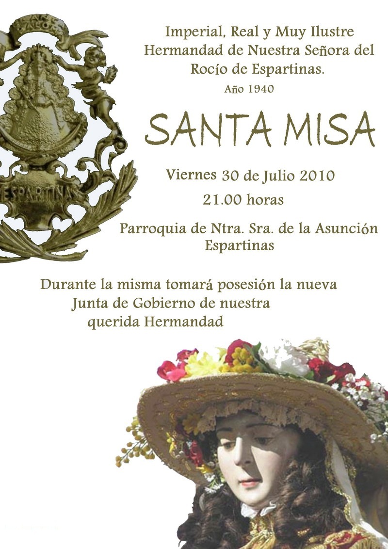 El próximo Viernes 30 de Julio de 2010, D.m., en la parroquia de Nuestra Señora de la Asunción de Espartinas, tendrá lugar la toma de posesión de la nueva Junta de Gobierno de nuestra Hermandad, encabezada por nuestro Hermano D. Juan José Mateos.