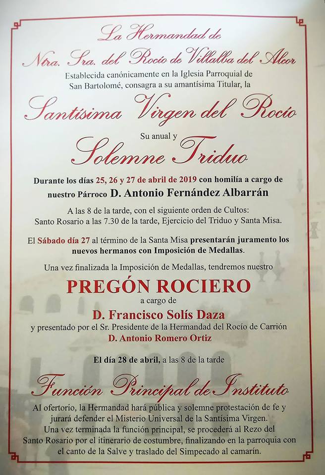 Hermandad de Villalba del Alcor – Solemne Triduo y Pregón a cargo de D. Francisco Solis Daza