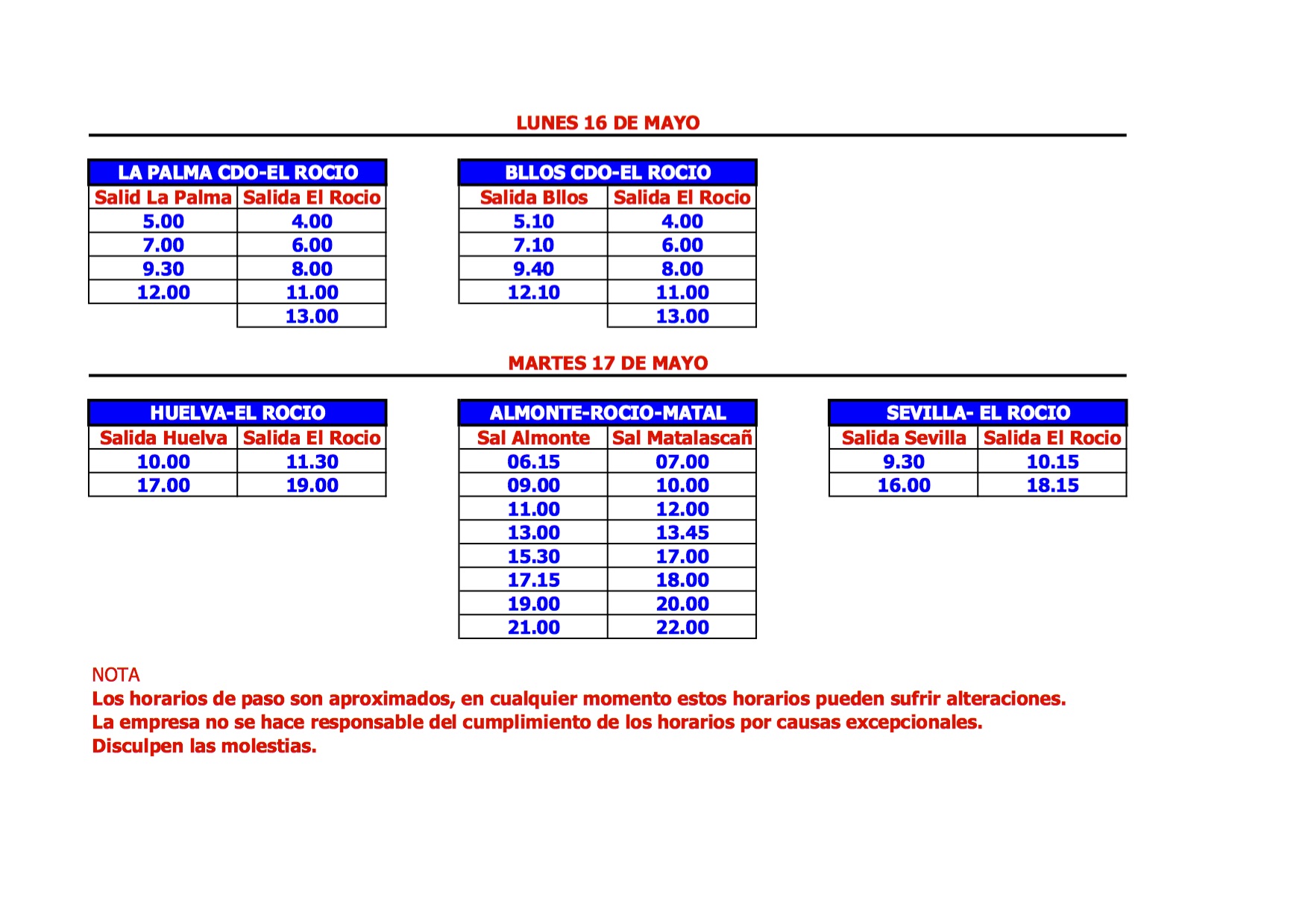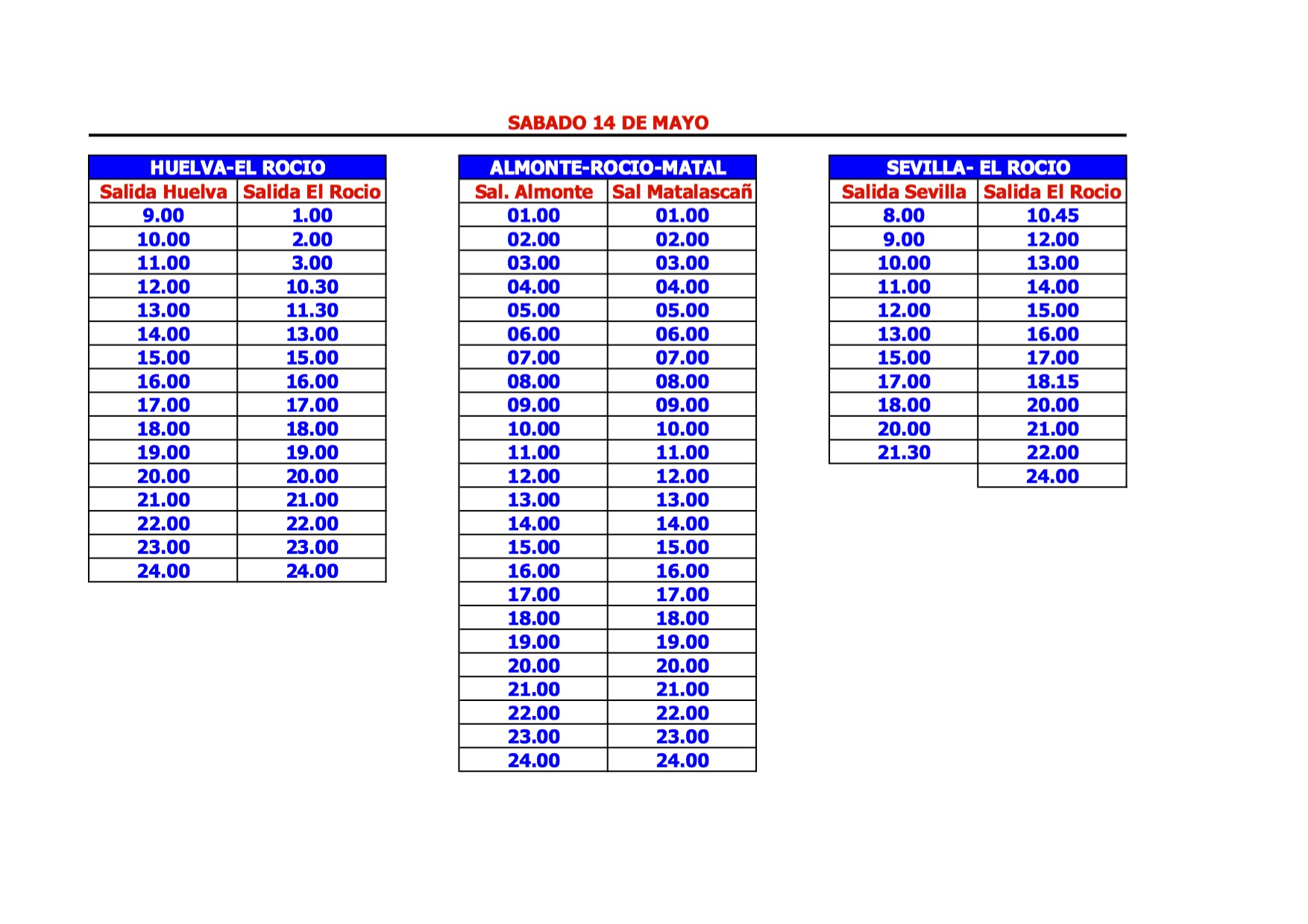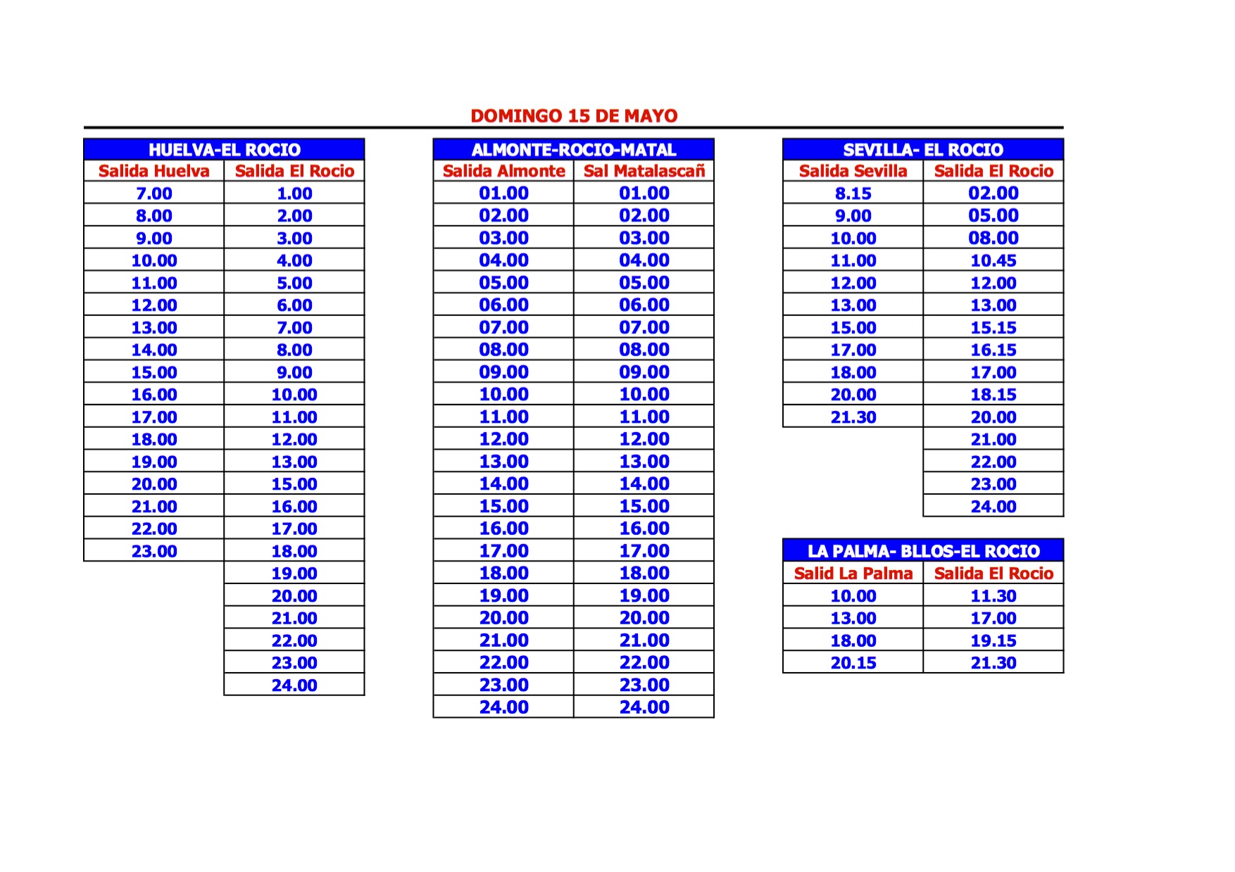 Buenos dias, sólo queria saber si no es mucha molestia, los horarios de autobuses del domingo 15 de mayo del El Rocio-Almonte. Sé que para el sádado 14 hay autobuses a cada hora de Almonte-El Rocio, pero me gustaria saber para la vuelt, domingo 15 de mayo. muchas gracias.