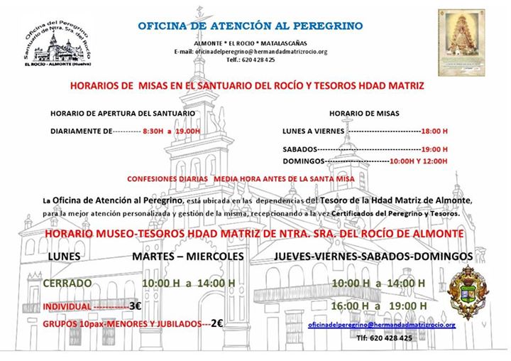 Necesito saber el horario de misa en el santuario de la Virgen del Rocio este sábado día 30 de noviembre 2019 alguien me puede informar por favor.