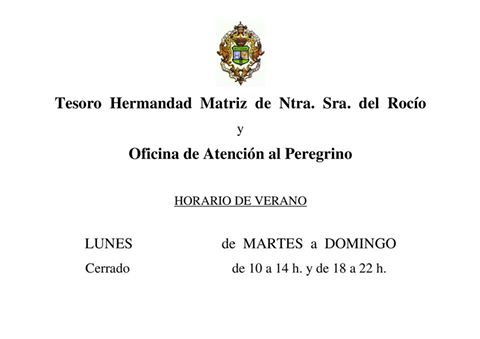A partir del sábado 18 de junio de 2016 será efectivo este horario del Tesoro de la Hermandad Matriz de Ntra. Sra. del Rocío y de la Oficina de Atención al Peregrino, previsto para la temporada estival.