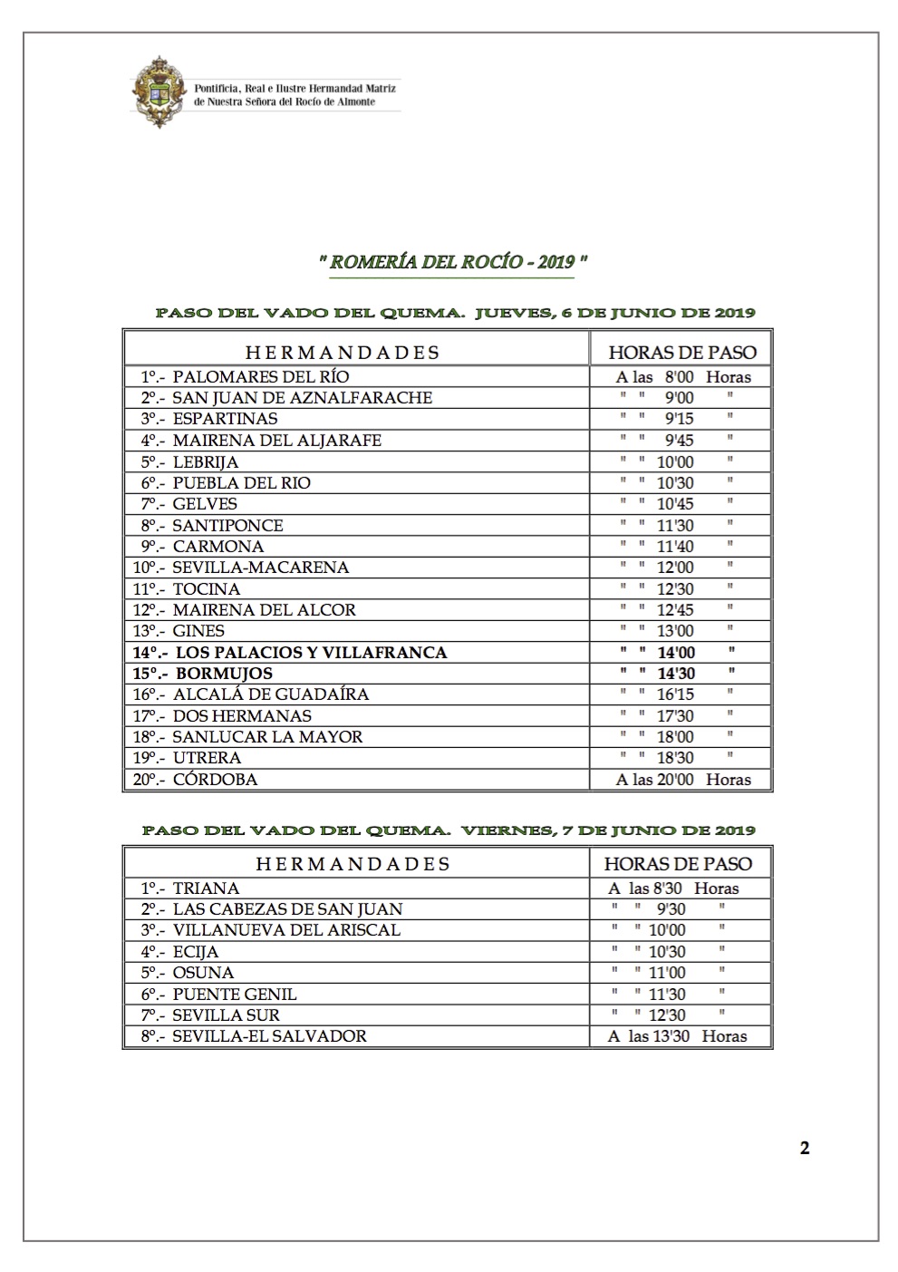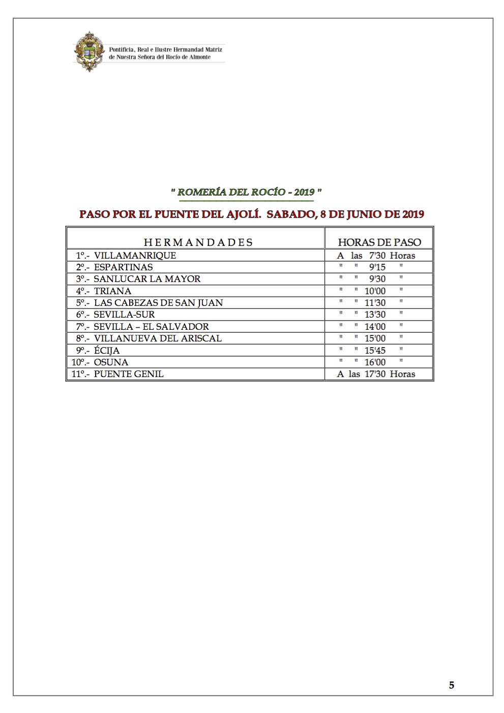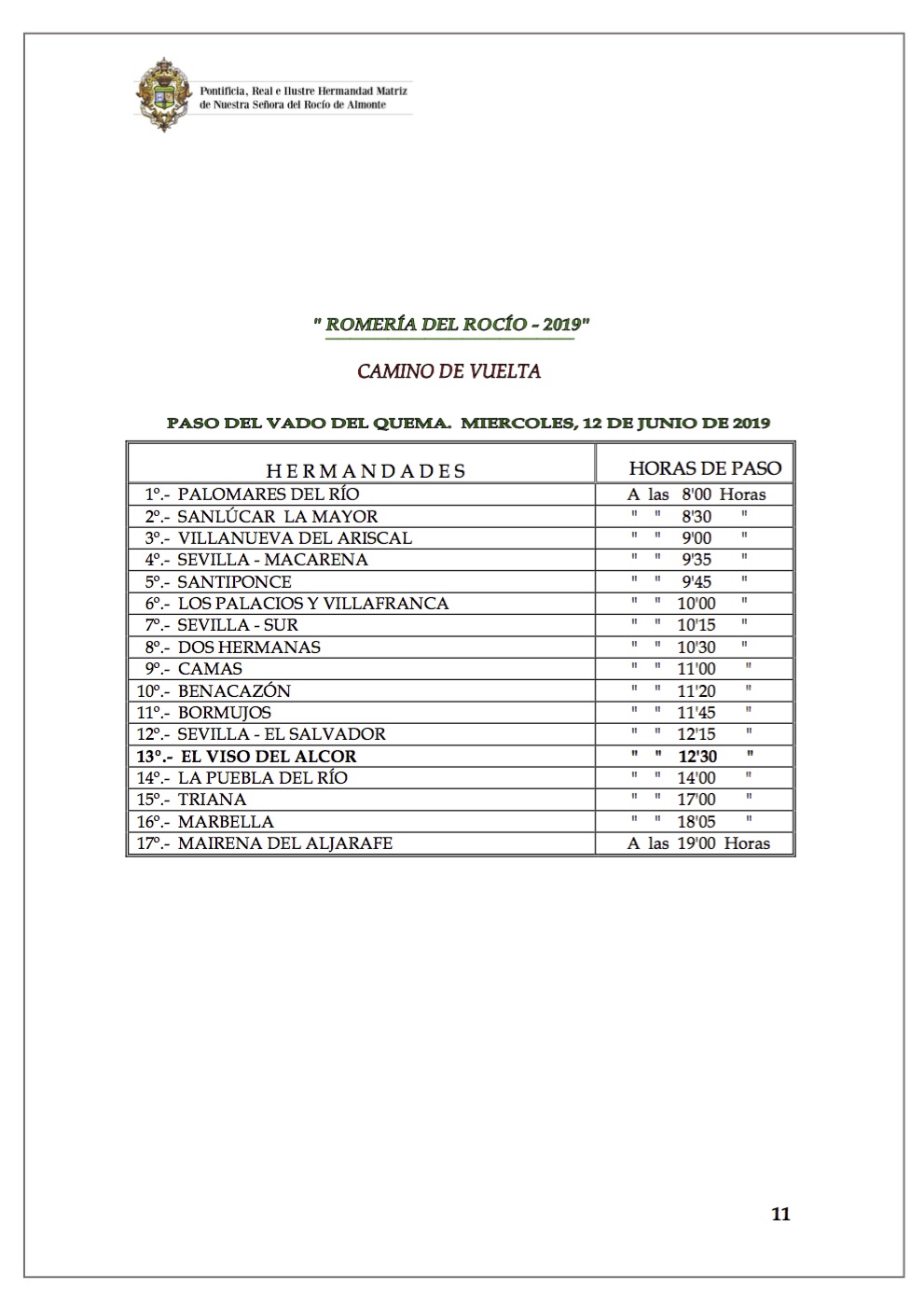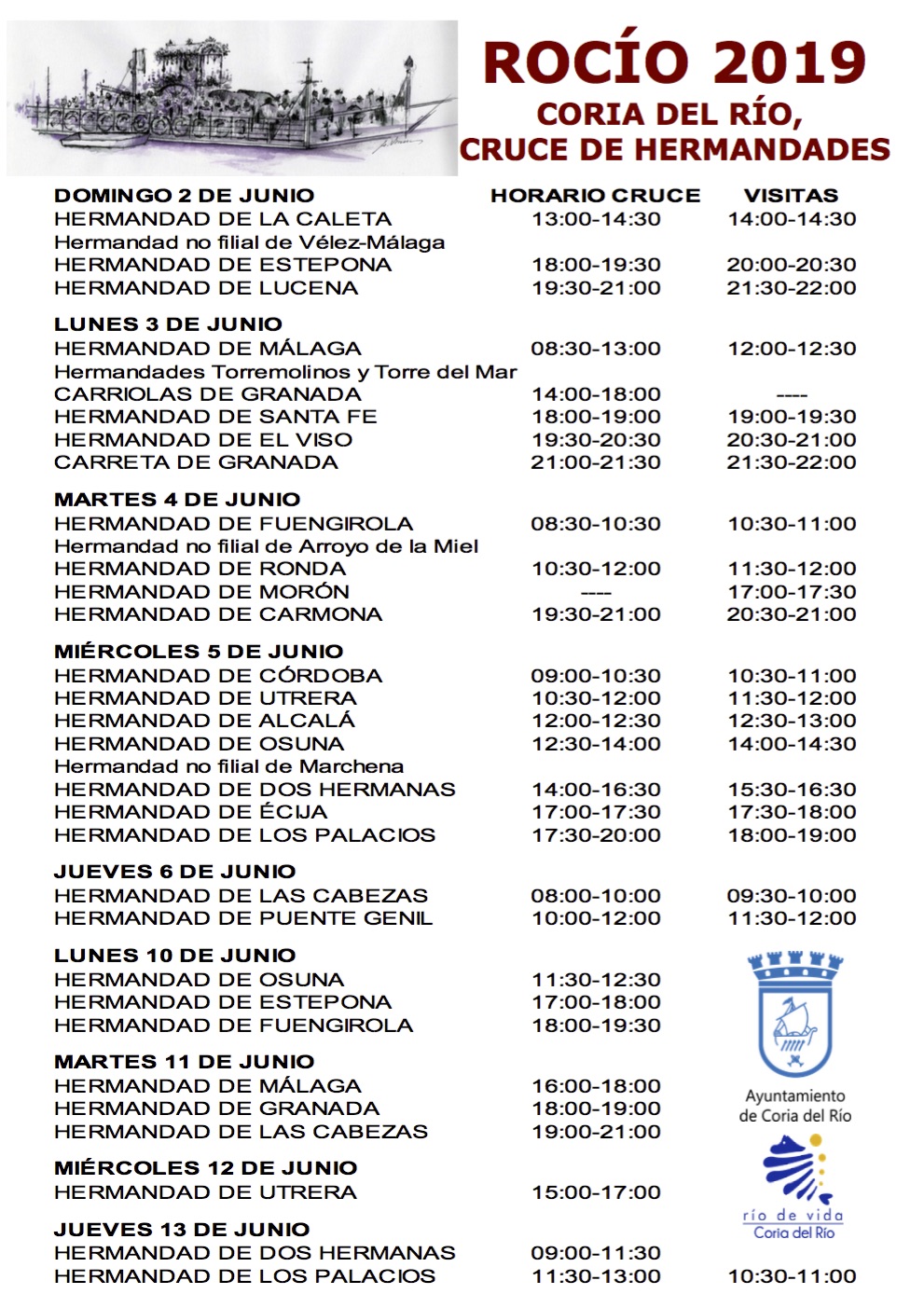 HORARIOS DEL CRUCE DE LAS HERMANDADES POR EL RÍO GUADALQUIVIR A SU PASO POR CORIA DEL RÍO 2019