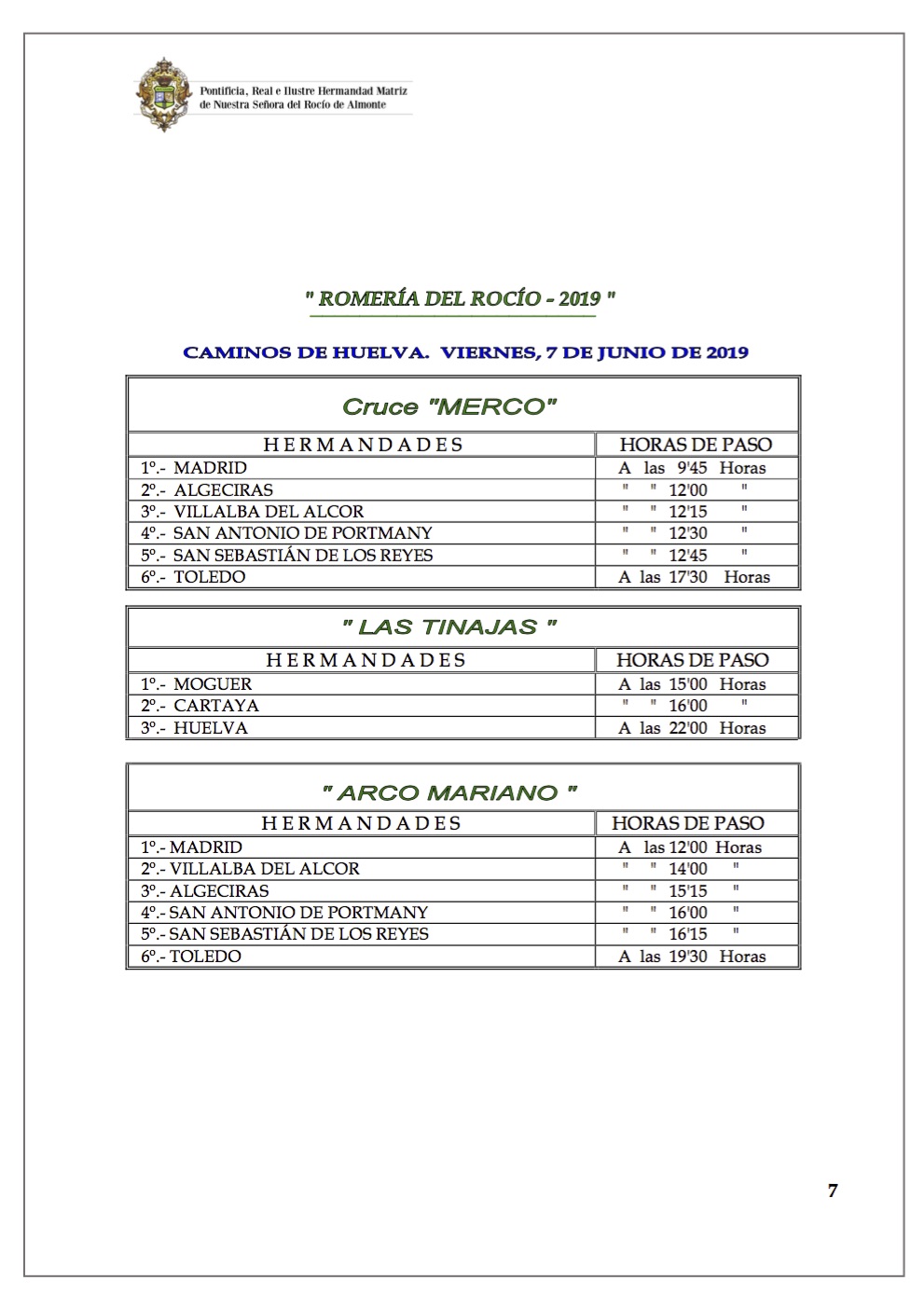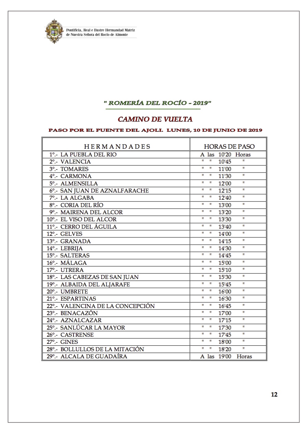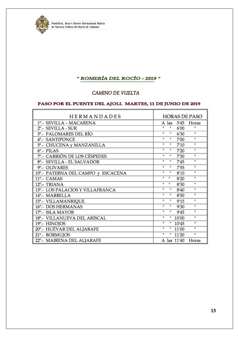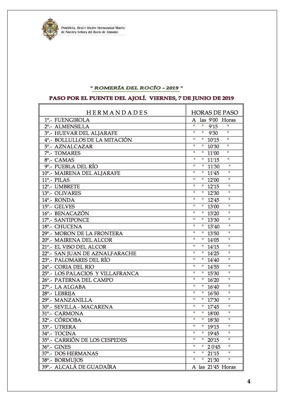 HORARIOS DEL CRUCE DE LAS HERMANDADES POR EL RÍO GUADALQUIVIR A SU PASO POR CORIA DEL RÍO 2019
