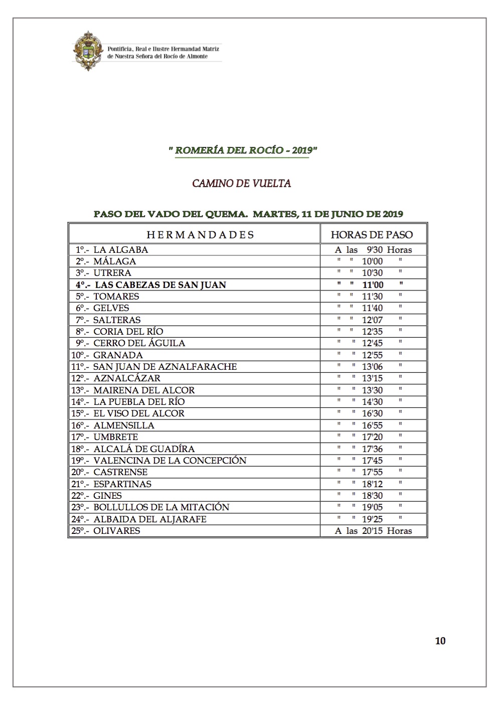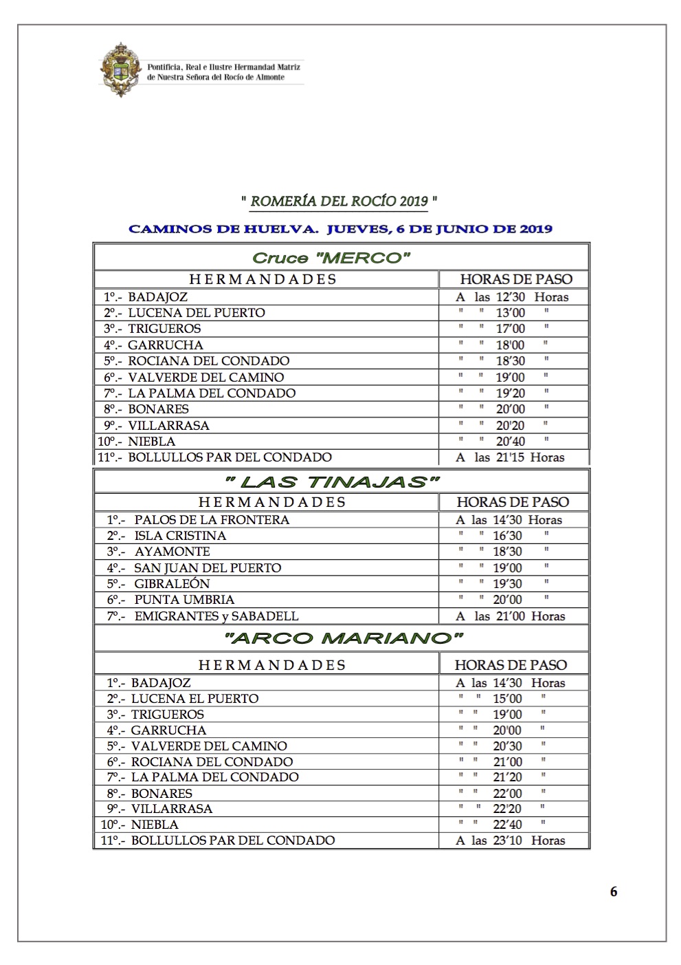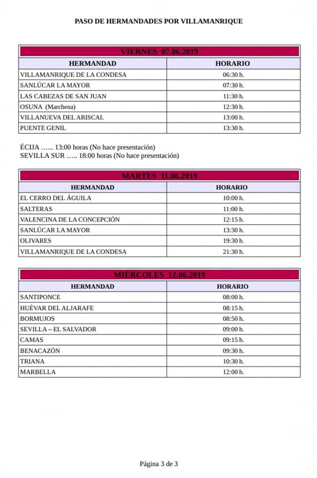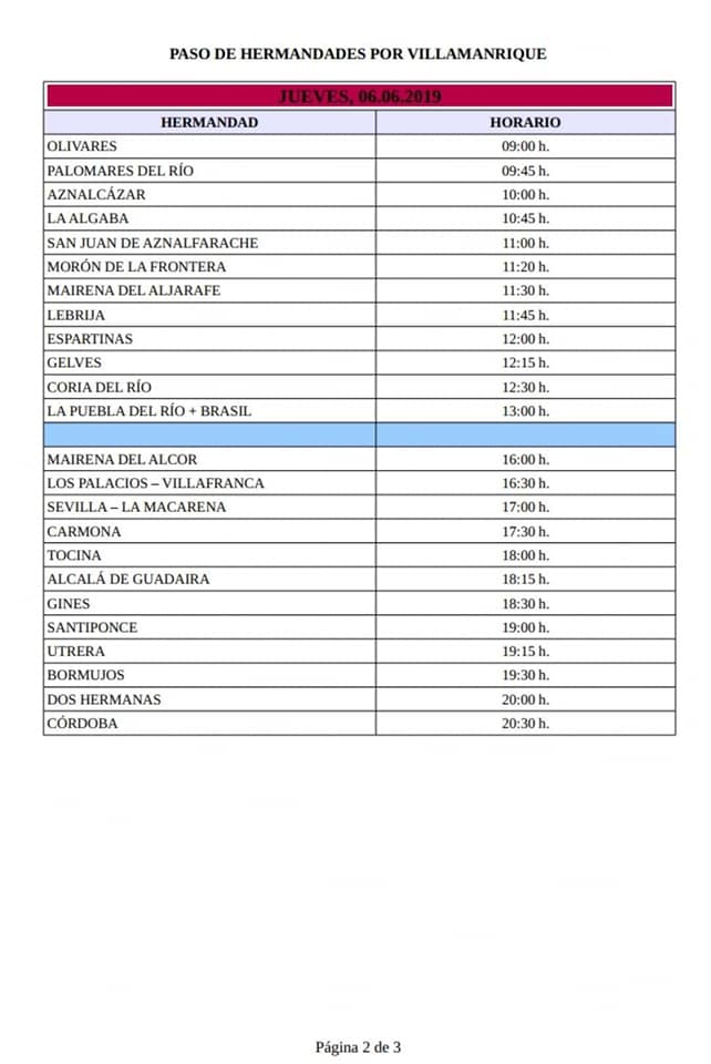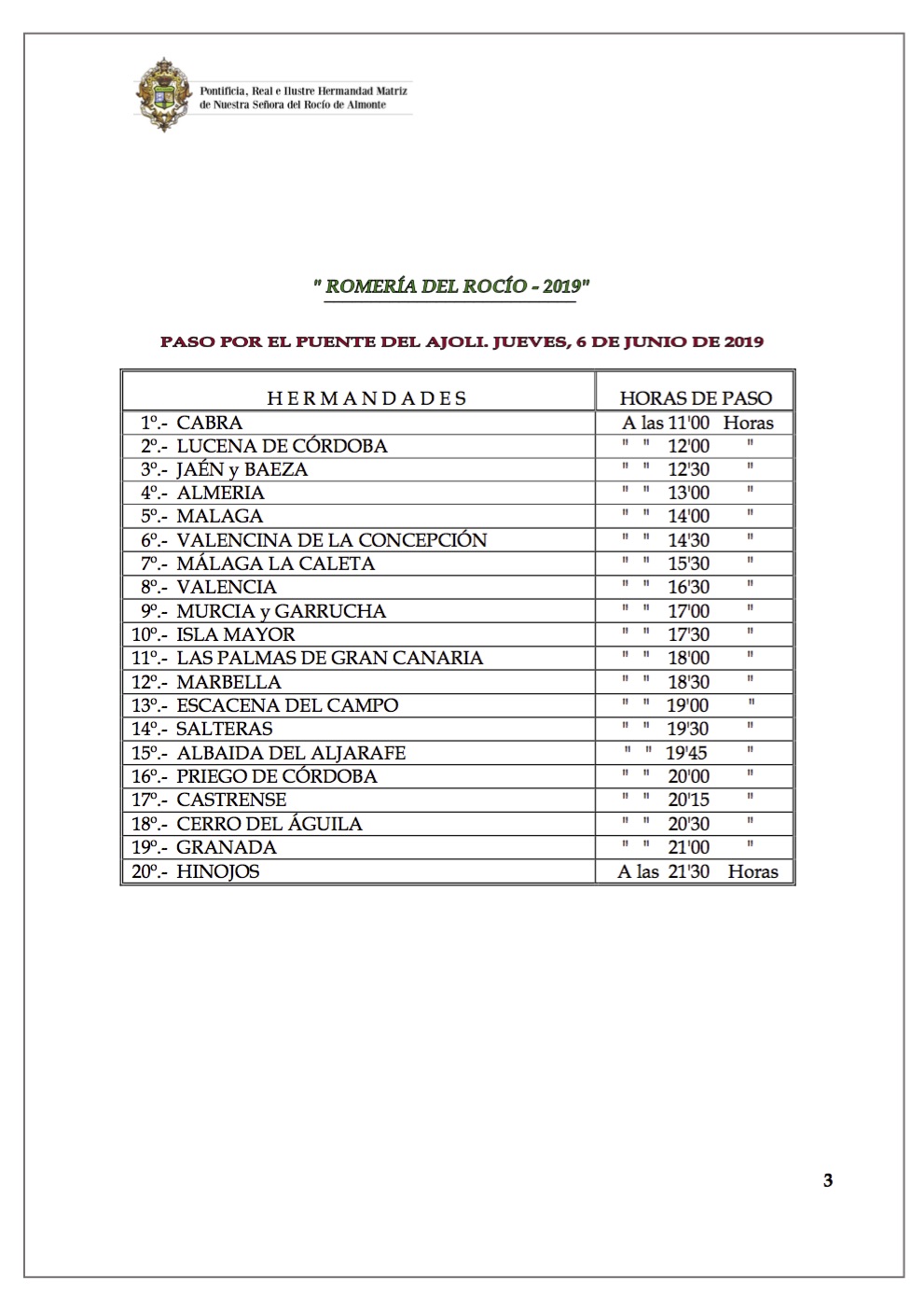 HORARIOS DEL CRUCE DE LAS HERMANDADES POR EL RÍO GUADALQUIVIR A SU PASO POR CORIA DEL RÍO 2019