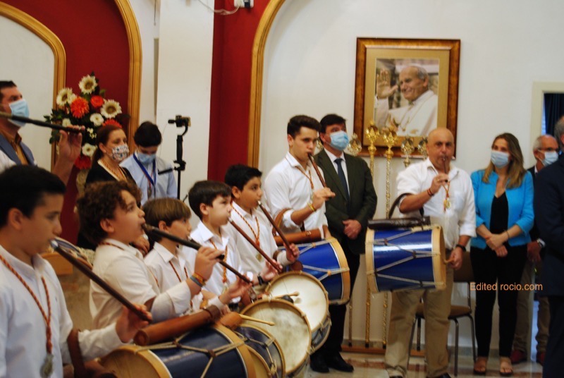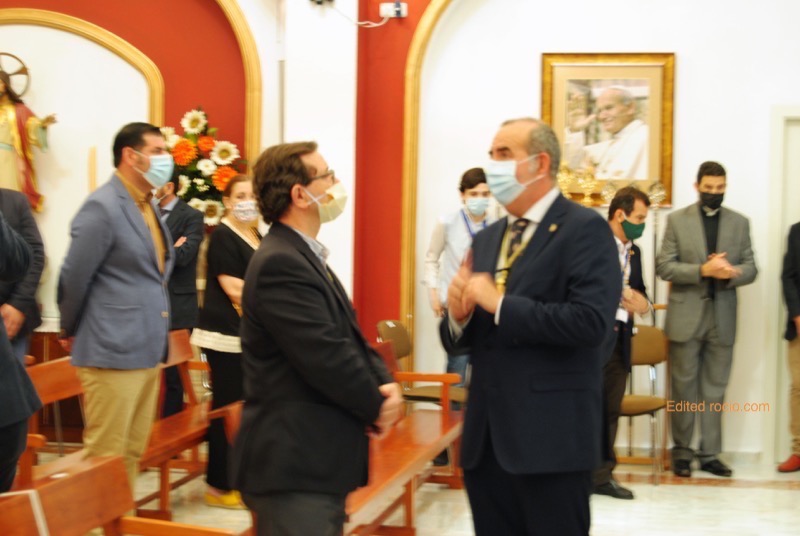 Una mañana más de este Rocío de “fe, esperanza y luz” el rezo del Ángelus que ambas hermandades han realizado conjuntamente y que ha contado además con la presencia del alcalde de Huelva, Gabriel Cruz, y la teniente de alcalde María Villadeamigo, se iniciaba con la entrada en la capilla de los tamborileros de Emigrantes a los sones de la Salve, para dirigir la oración el vocal de Cultos y Espiritualidad de la hermandad, José Antonio Gallardo Arroyo.