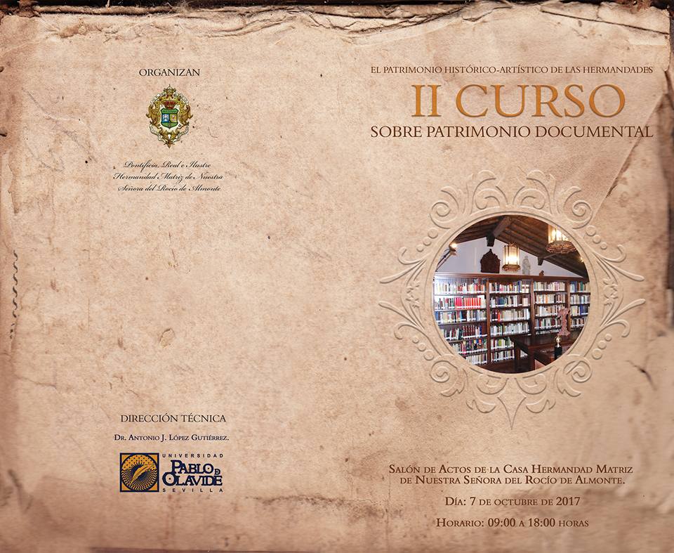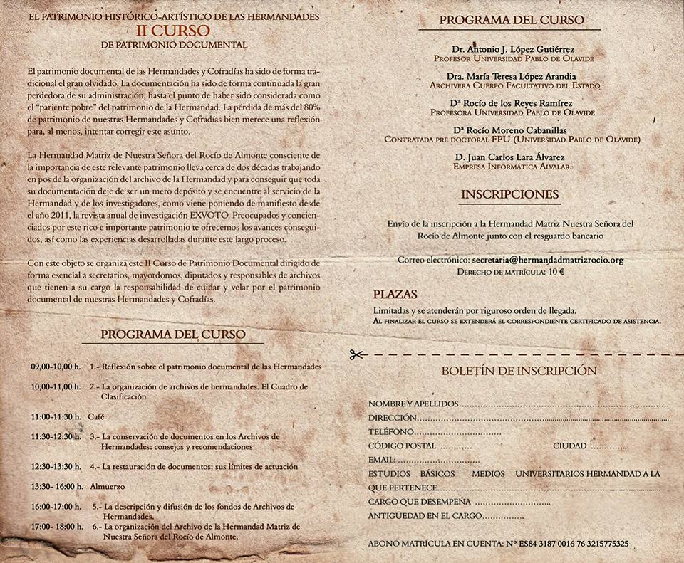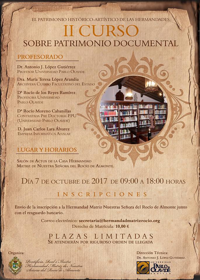 La Hermandad Matriz, a través de su Secretaría, organiza un segundo curso sobre Patrimonio Documental, que pretende ayudar a las hermandades del Rocío, cofradías de penitencia y a las personas interesadas en general a valorar y mejorar la conservación de uno de los activos más importantes de cualquier institución, y especialmente de nuestras hermandades, el patrimonio documental, con las técnicas más novedosas y avanzadas. El curso está dirigido por el profesor Dtor. Antonio López Gutiérrez, especialista en la materia, profesor de la Universidad Pablo de Olavide y director de los trabajos de ordenación y catalogación del archivo de la Hermandad Matriz. De su mano participan otros cualificados profesionales y docentes en la materia.