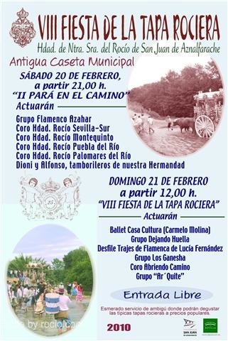 II Pará rociera y la VIII Feria de la tapa rociera. Ambos actos se celebraran en la Antigua Caseta Municipal con entrada libre , precios populares, selecto ambigu y amplia zona de aparcamiento.