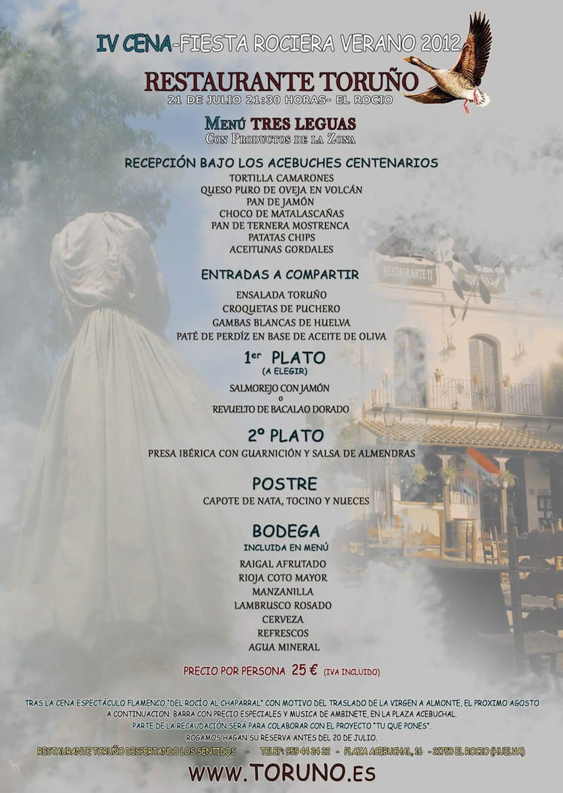 El próximo dí 21 de julio se celebrará la IV Cena Rociera en el Restaurante Toruño en la Aldea de El Rocío. Es una fiesta que hacemos todos los años en esta fechas. Este año la queremos dedicar al Traslado, donaremos una parte de la recaudación al programa "Tu que pones" del Ayto de Almonte, para la compra de material para los arcos del Rocio. EL evento consistirá en una cena y a continuación, un espectáculo de sevillanas con actuación de artistas almonteños.