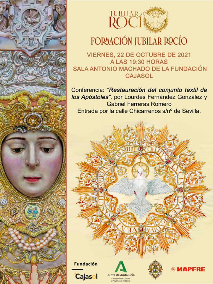 El viernes 22 de octubre dentro de las actividades de formación que estamos desarrollando en la sede de la Fundación Cajasol, la Sala Antonio Machado acogió la conferencia: “Restauración del conjunto textil de los Apóstoles”. A cargo de Lourdes Fernández González y Gabriel Ferreras Romero. Restauradora textil e historiador del Instituto Andaluz de Patrimonio Histórico (IAPH), respectivamente.