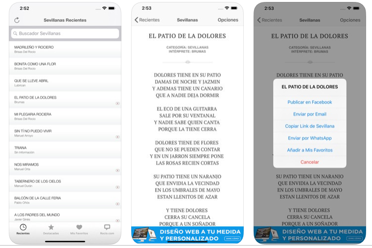 A partir de ahora puedes disfrutar de miles de letras de sevillanas en tu Móvil o IPAD y, en la mayoría, ver sus vídeos Youtube. Tendrás las letras y vídeos a la mano y podrás disfrutar con el buscador al poner cualquier frase o palabra de una sevillana para encontrarla entre más de 3.000, también podrás guardar las favoritas. Desde la App podrás publicar en Facebook, enviar por email y enviar por WhatsApp a un amigo.