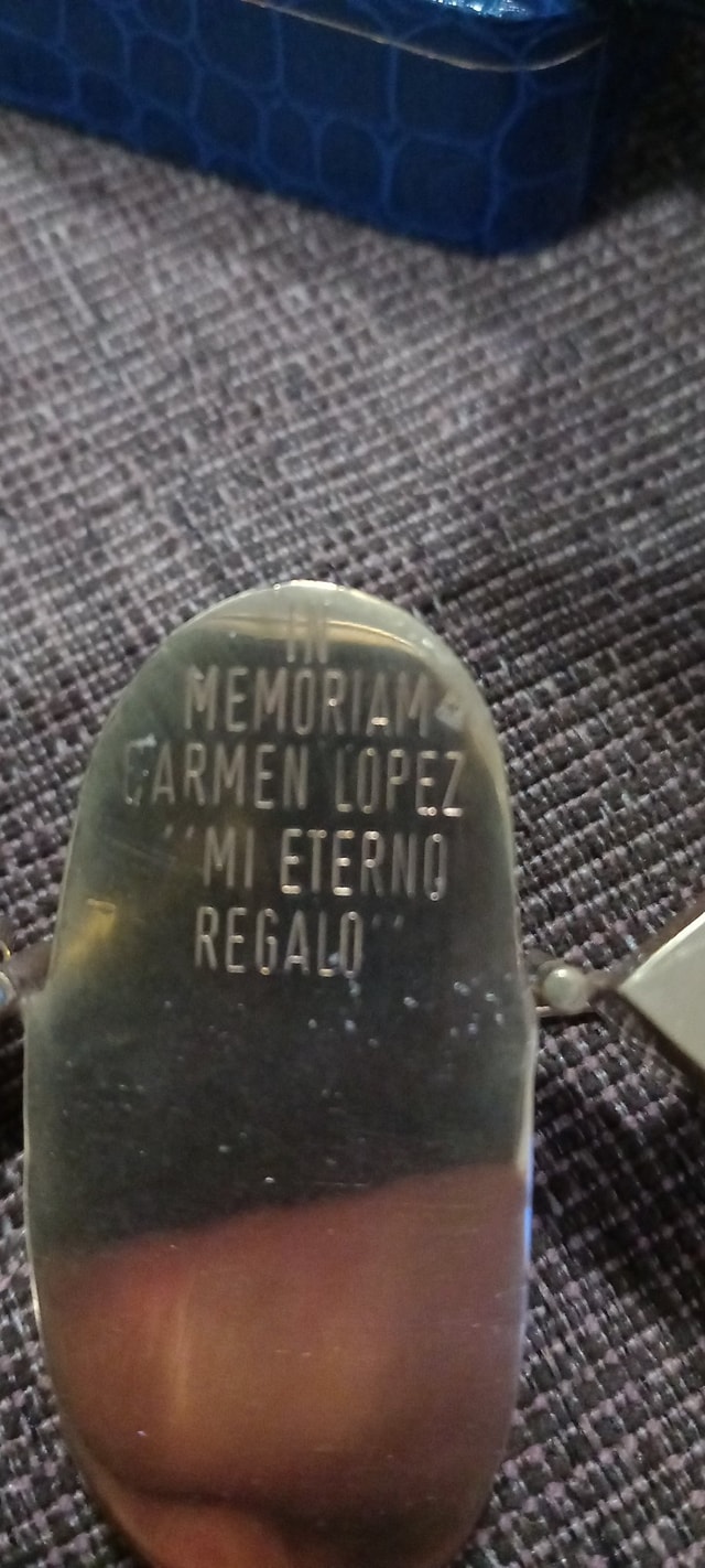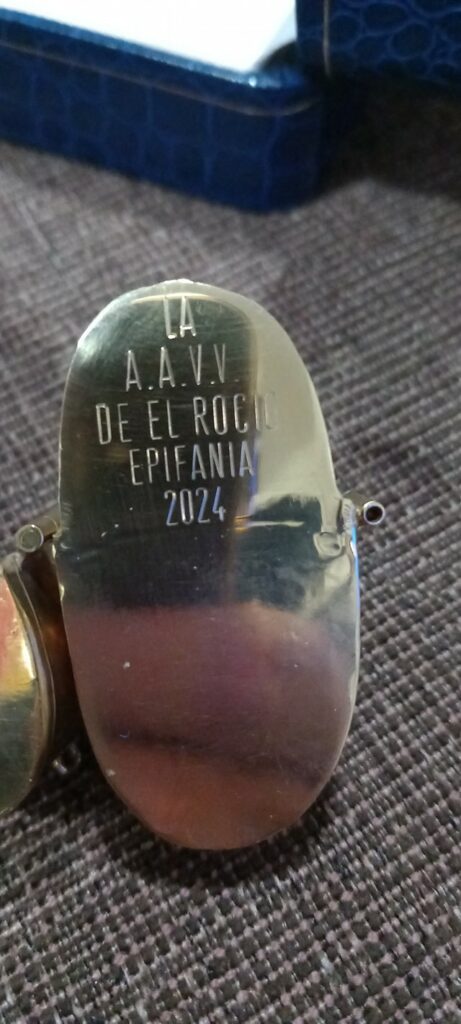 Como es tradicional y así lo marcan los estatutos de la primera cabalgata en 1976,de ofrecer a perpetuidad un regalo al Pastorcito Divino.En esta ocasión hemos querido cumplir el deseo in memoriam de Carmen Lopez persona q tanto hizo por esta cabalgata y por la aldea de El Rocio en general.Siempre fué su deseo de hacer este regalo por eso lleva la inscripción «IN MEMORIAM CARMEN LOPEZ MI ETERNO REGALO» Y .