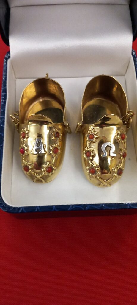 Los zapatitos han sido elaborados en plata sobredorada con incrustaciones de coral y con las letras alfa y omega del abecedario griego.