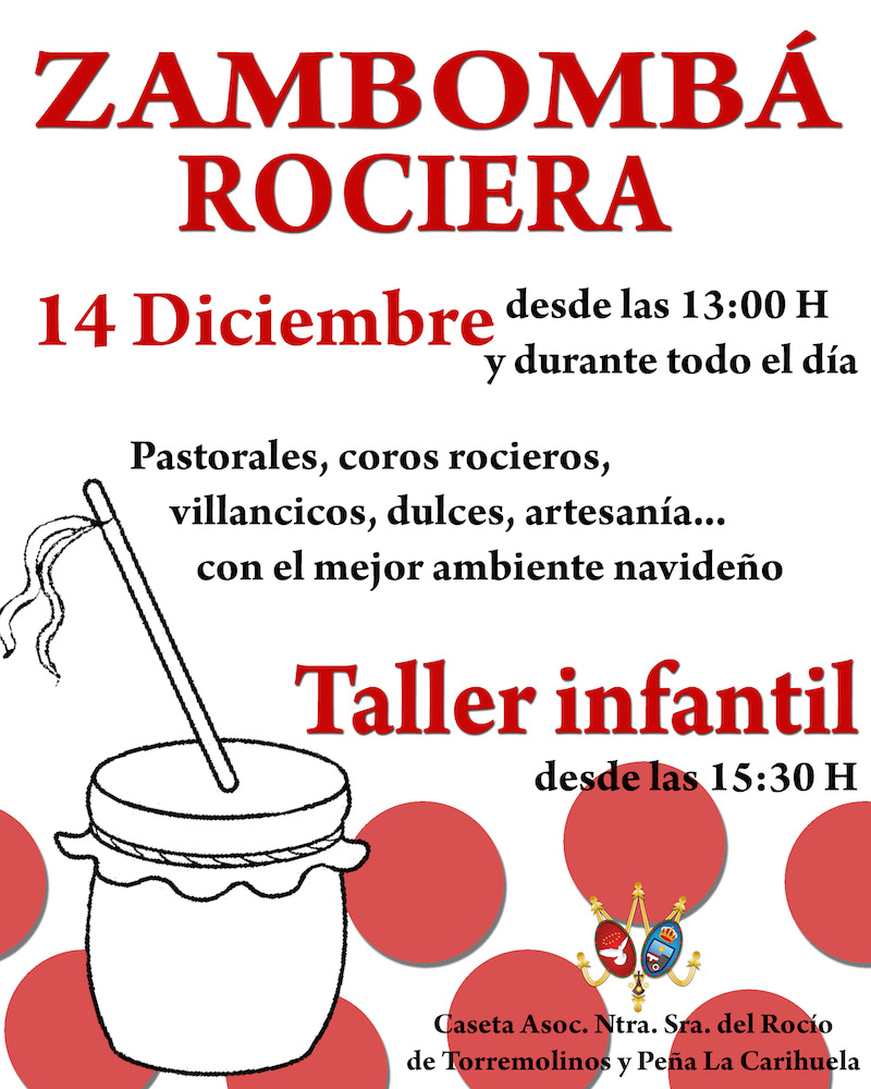 Con motivo de la Navidad, La Asociación Ntra. Sra. del Rocío de Torremolinos organiza su ya tradicional Zambombá Rociera el próximo sábado 14 de diciembre. Desde las 13:00 H te esperamos en nuestra Zambombá en la caseta de la Asociación situada en el recinto ferial del municipio, donde se podrá disfrutar durante todo el día de nuestra barra con la calidad y precios de siempre, contaremos con las actuaciones de grandes pastorales, grupos rocieros, puestecitos navideños, etc. El mejor ambiente rociero y navideño que envuelve la magia de la Navidad.