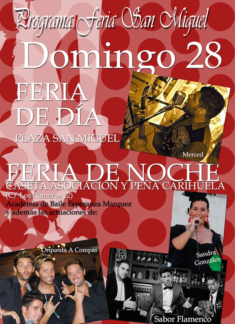 El sábado, en la feria de día en la Plaza San Miguel, contarán con el grupo Sabor Flamenco; y por la noche es el turno de los Hermanos Ortigosa y la Orquesta a Compás. El domingo por la mañana, el grupo Merced animará la jornada en la feria de día; y por la noche Sandra González, Sabor Flamenco y la Orquesta a Compás culmirarán la jornada.