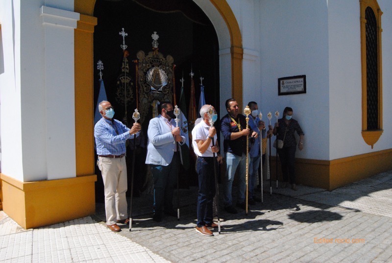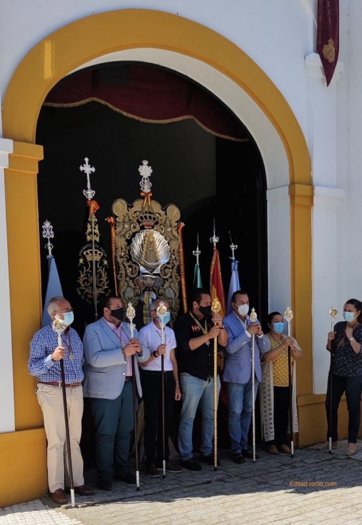 El Simpecado salía hasta el dintel de la puerta de entrada de la capilla, acompañado por algunos de los miembros de la junta de gobierno de la filial rociera y numeroso público se concentraba en torno a la casa de hermandad para vivir este hermoso acto que se ha venido celebrando durante el Rocío de Luz y Esperanza, respectivamente.