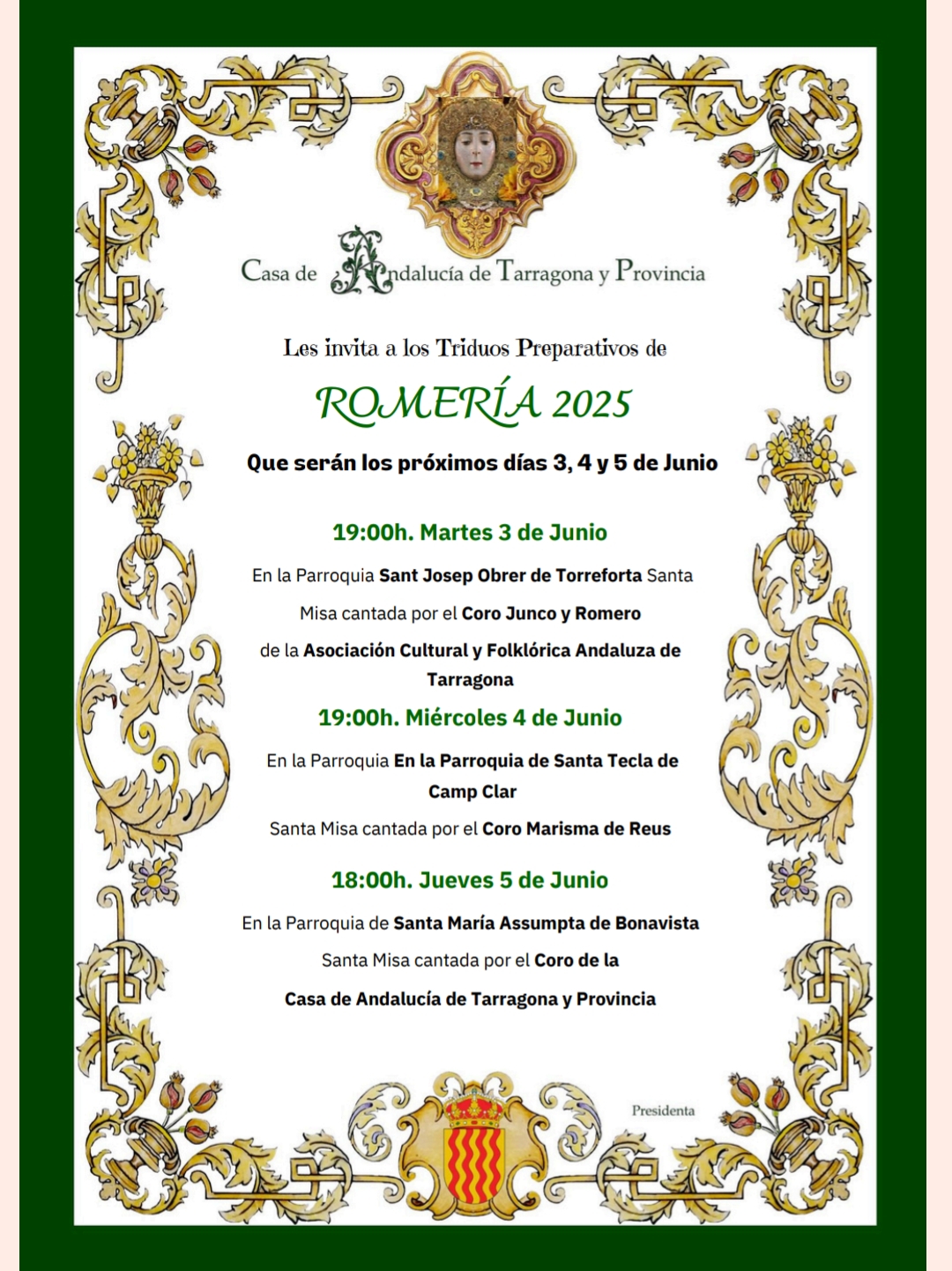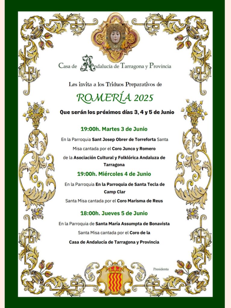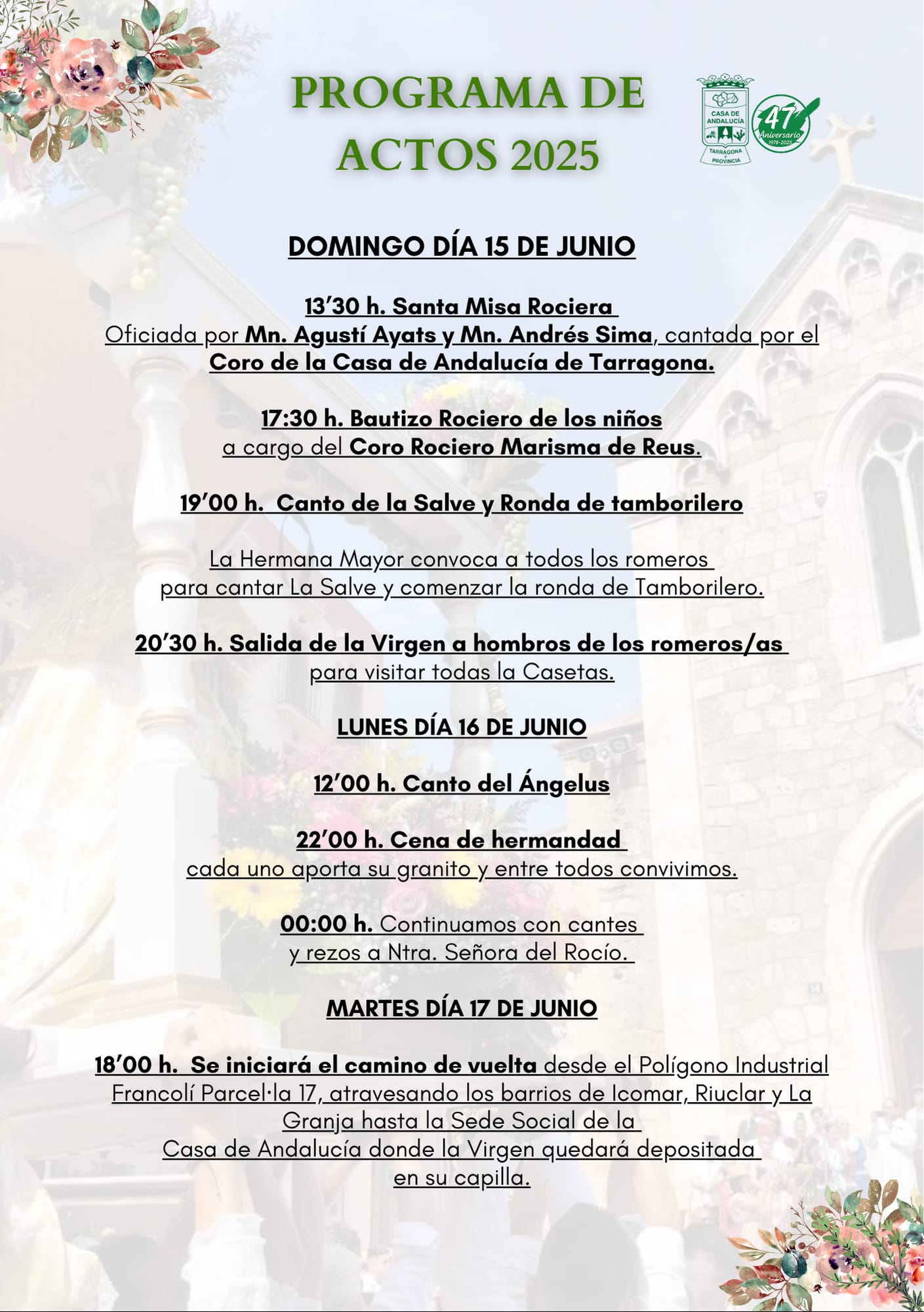 Un año más, desde Tarragona, La Casa de Andalucía de Tarragona y Provincia, comienza los preparativos para la celebración de nuestra Romería en Honor a Ntra. Sra. Del Rocío, los días 13, 14, 15, 16 y 17 de Junio.