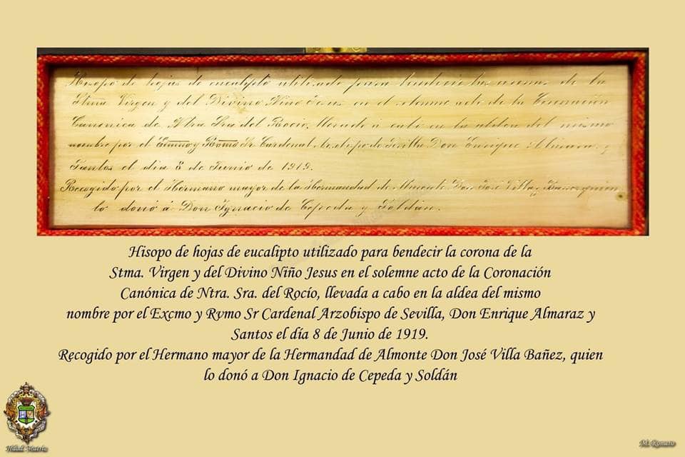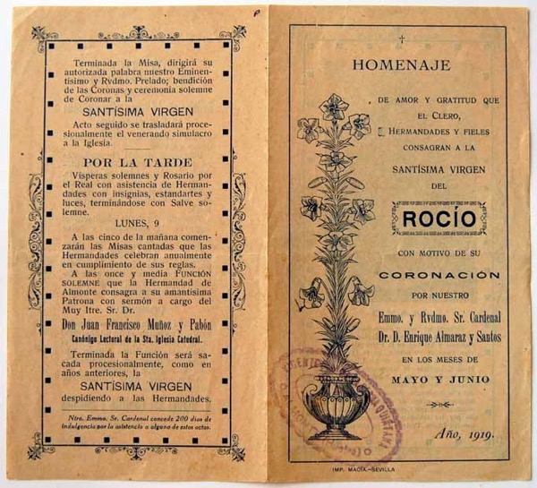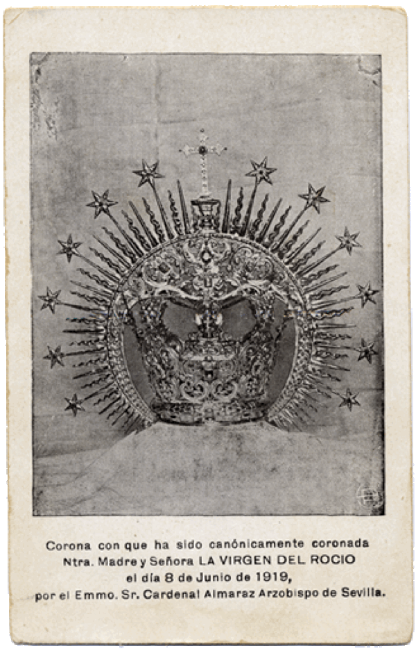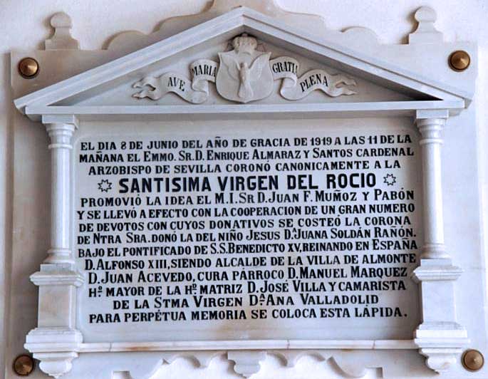 Por la Bula Pontificia del 8 de septiembre de 1918 se ordena y manda sea coronada Nuestra Señora del Rocío. Esta Coronación Canónica se llevó a cabo en una ceremonia solemne el día 8 de junio de 1919, por el Excmo. y Rvdmo. Cardenal de Sevilla Don Enrique Almaráz y Santos.