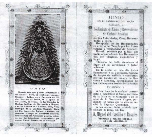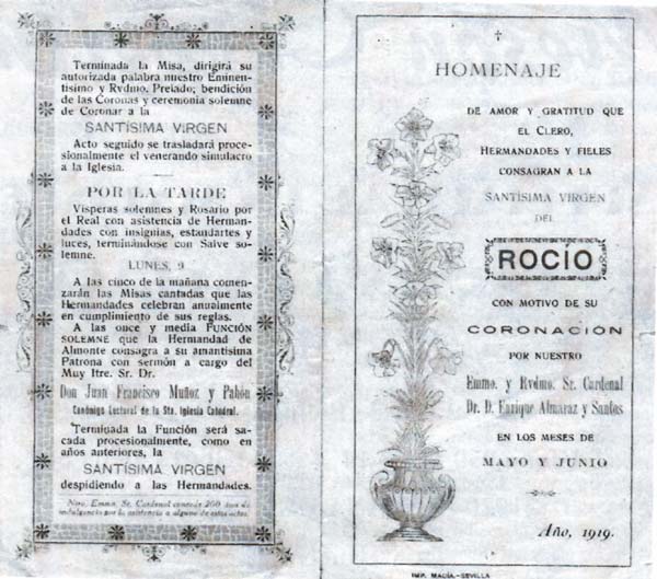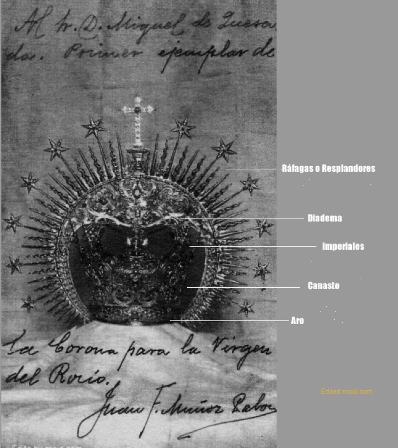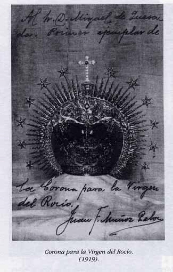 «Mi querido amigo: Por la Blanca Paloma de las marismas andaluzas,todo. Estoy a las órdenes de usted, o de quien cultive su iniciativa, para ayudar modestamente, pero con buena voluntad, en la feliz idea de coronar a la Santísima Madre de Dios, mi Santa Madre del Rocío, con corona en que el amor y la fe, el oro y los brillantes digan lo que queremos todos a la Señora de nuestros pensamientos…