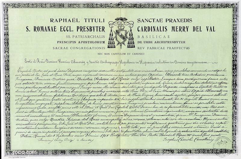 Título de Concesión de la Coronación Canónica de la Virgen (8/6/1919) que se conserva en el Tesoro de la misma.