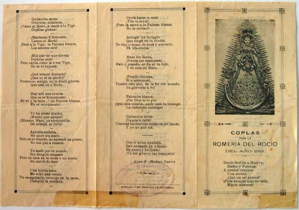 Anteriormente había existido un cuento: «El traje de luces», del presbítero de Niebla, Cristobal Jurado Carrillo, premiado por la Academia Bibliográfica-Mariana en 1915 y publicado en Lérida en 1916, que cuenta la historia de un torero andaluz y en el que se habla de la coronación de la Virgen del Rocío.