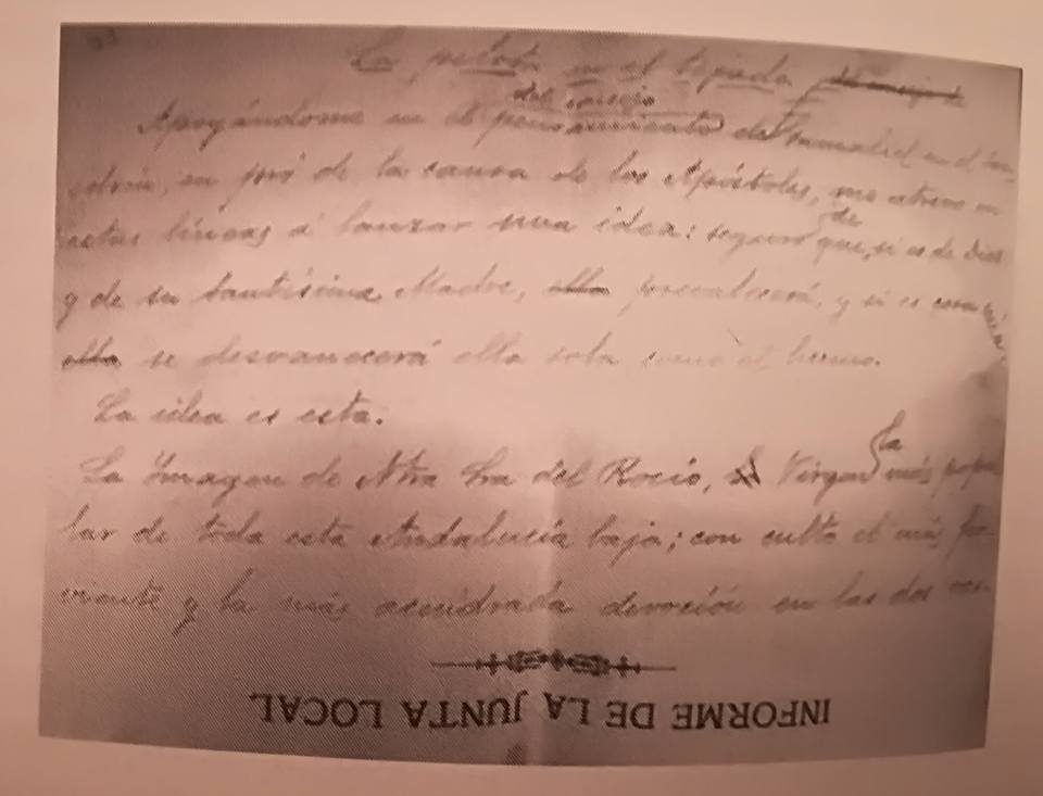 No me cabe la menor duda, contando con tan valiosos elementos, todos rocieros de cepa como Manuel Siurot, José Anastasio Martín y el Lectoral de Sevilla, y con la eficaz cooperaciónde la distinguida Srta. Dª María Magdalena Almaraz y Santos, de la respetable dama Dª Juana Soldán, viuda de Cepeda, y dela popular Dª Ana Valladolid reuniremos cuanto hemos de menester para rendir este justísimo homenaje de amor, de devoción y ternura, a la bendita Virgen marismeña.