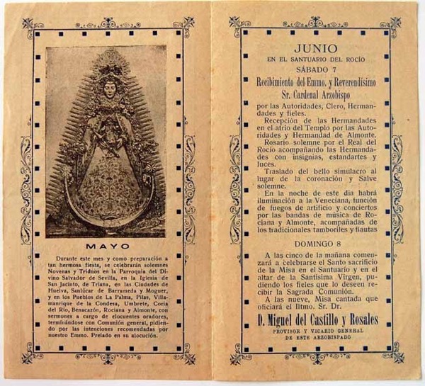 «Muy señor mío y respetable amigo: Como camarista de la Santísima Virgen del Rocío y como almonteña, debo expresar a usted el gran júbilo que me ha producido su hermoso y laudable artículo publicado en la prensa sobre la coronación canónica de mi idolatrada Virgen.