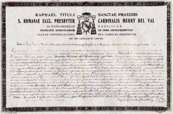 RAFAEL, DEL TITULO DE SANTA PRÁXEDES, DE LA SANTA IGLESIA ROMANA PREBITERO CARDENAL MERRY DEL VAL, ARCIPRESTE DE LA SANTA Y PATRIARCAL BASíLICA DEL PRINCIPE DE LOS APOSTOLES. DE ROMA, PREFECTO DE LA SAGRADA CONGREGACIóN DE LA REVERENDA FABRICA Y DEL CAPITULO Y CANóNIGOS DE LA MISMA