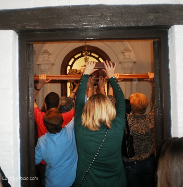 Allí se dieron momentos emocionantes e irrepetibles, ya que decidieron introducir la impresionante Cruz dentro de la pequeña Capilla, y con ella en alto, tocar la peana de la Stma. Virgen del Sin-Pecado. Tras las salida de la Cruz se introdujo el Icono Mariano en sus andas, y con ellas en alto frente a frente al Sin Pecado, se dieron vivas a la Virgen del Rocío, a la Madre de Dios y al Pastor Divino. En este momento rompieron en aplausos los cientos de personas que se concentraban en las inmediaciones. Tras la salida de la Capilla los tamborileros de la Hermandad del Rocío escoltaron con sones de paso de carretas a la Cruz Peregrina que llevaban los jóvenes y mayores de la Hermandad durante las siguientes estaciones.