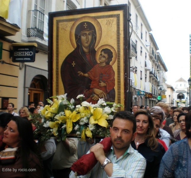 …alfombra de romero, sones de tamboriles y vivas rocieros ante el Sin Pecado de la Stma. Virgen del Rocío de la Hermandad de Santa Fe para recibir la bendición de la Cruz Peregrina y el Icono de María que S.S. Juan Pablo II envió a recorrer por el mundo en manos de los jóvenes.