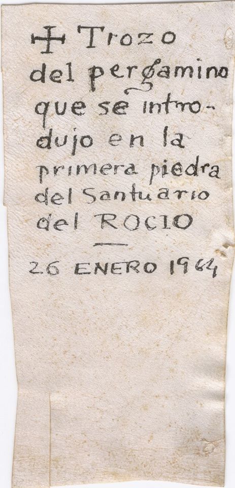 Fragmento del documento escrito en pergamino que daba fe del acto de colocación de la primera piedra del actual Santuario y firmado por las autoridades presentes en dicho acto. Dicho pergamino se incluyó en la caja de plomo, junto a otros documentos y objetos, que iba en el interior de la piedra que simbolizaba la inauguración de un hecho muy importante en la historia rociera: la construcción del actual Santuario en los años 60. El acto se llevó a cabo el 26 de enero de 1964. Del pergamino sobrante, tras la escritura del texto y las firmas de las autoridades, ha llegado al fondo del CER (Ayuntamiento de Almonte) este pequeño trozo de 13 x 6,5 cm a través del archivo privado de la familia Díaz de la Serna Carrión donado al CER en 2003, muy posiblemente por medio de una de las personas directamente implicadas en aquella ceremonia y que mantenía una buena relación de amistad con la familia donante: Juan Infante Galán.