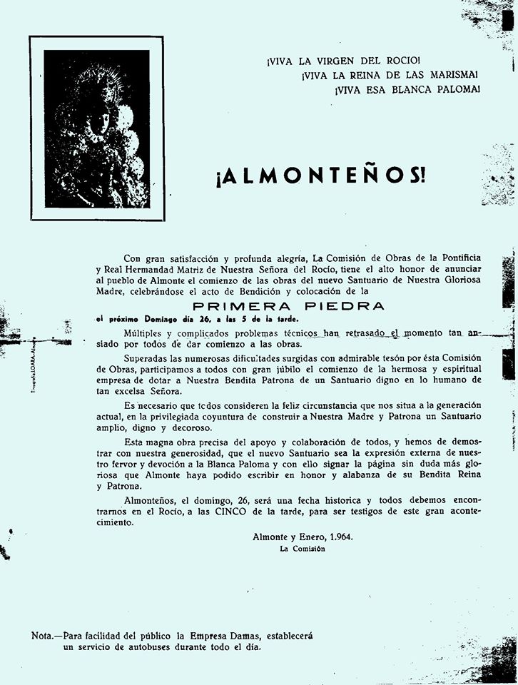 » … Y es llegada la hora de ofrecer a la Blanca Paloma un Templo más digno y en consonancia con la devoción rociera; que sea como un cortijo andaluz, con su cal, sus colores blancos y con la riqueza sencilla necesaria y conveniente para su culto y para la agradable estancia de cuantos acudan a implorarlos favores de la Santísima Virgen. … «