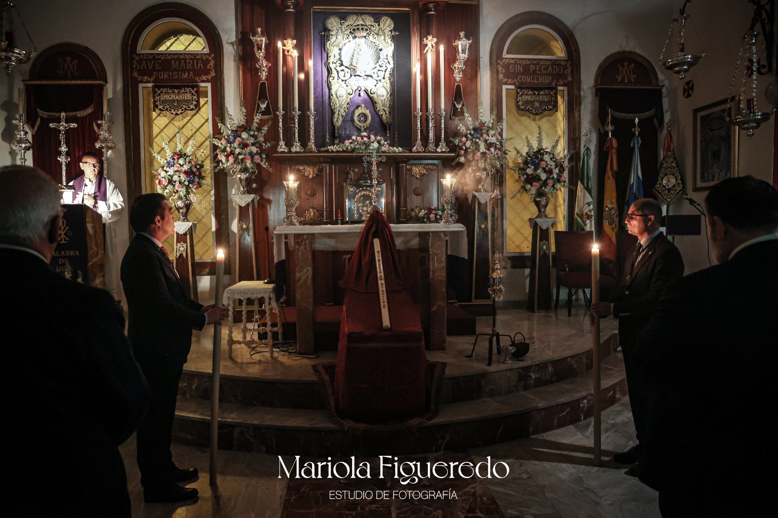 El vicario parroquial de la Merced, Alvaro Gómez, fue el encargado de dirigir las oraciones y bendijo el cirio que estará expuesto en la capilla de la casa de hermandad de Huelva junto con el Simpecado y que viene a refrendar ese hermanamiento que ambas entidades se procesan y suscribieron.