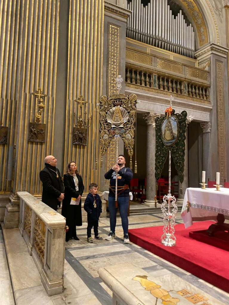 Uno de los momentos más destacados de la jornada fue el encuentro histórico entre los simpecados de la Hermandad de Emigrantes y el de la Hermandad Matriz de Nuestra Señora del Rocío de Almonte. Por primera vez, ambas insignias coincidieron en la ciudad de Roma, conmemorando así una ocasión única dentro del Año Jubilar. La iglesia de Santiago y Montserrat, hogar de los españoles en Roma, acogió este encuentro, donde se oró y se cantó la Salve, seguidos de una visita al tesoro del templo, guiada por el rector José Jaime Brosel Gavilá.